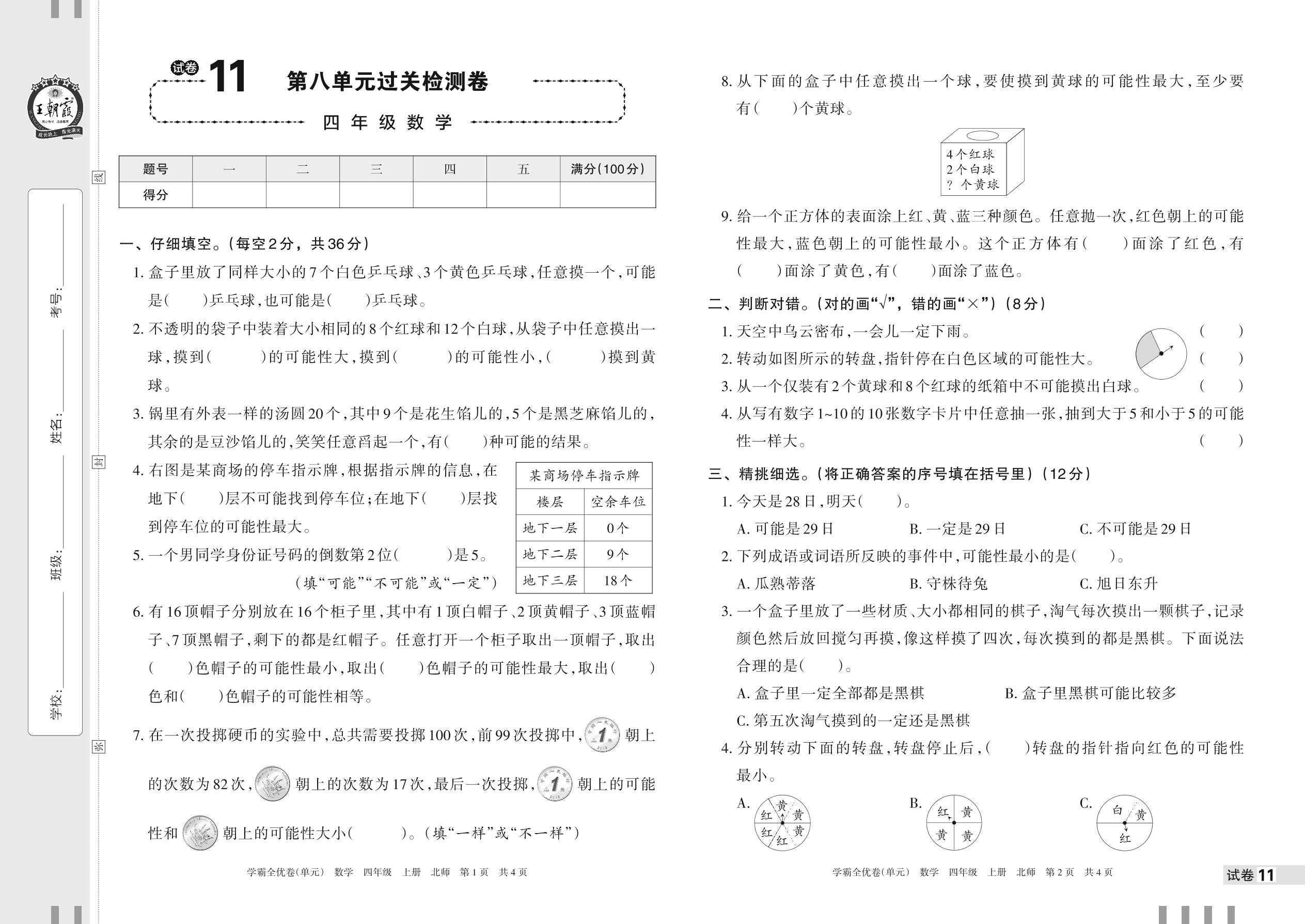 2022上册四年级数学北师版 试卷11 第八单元过关检测卷