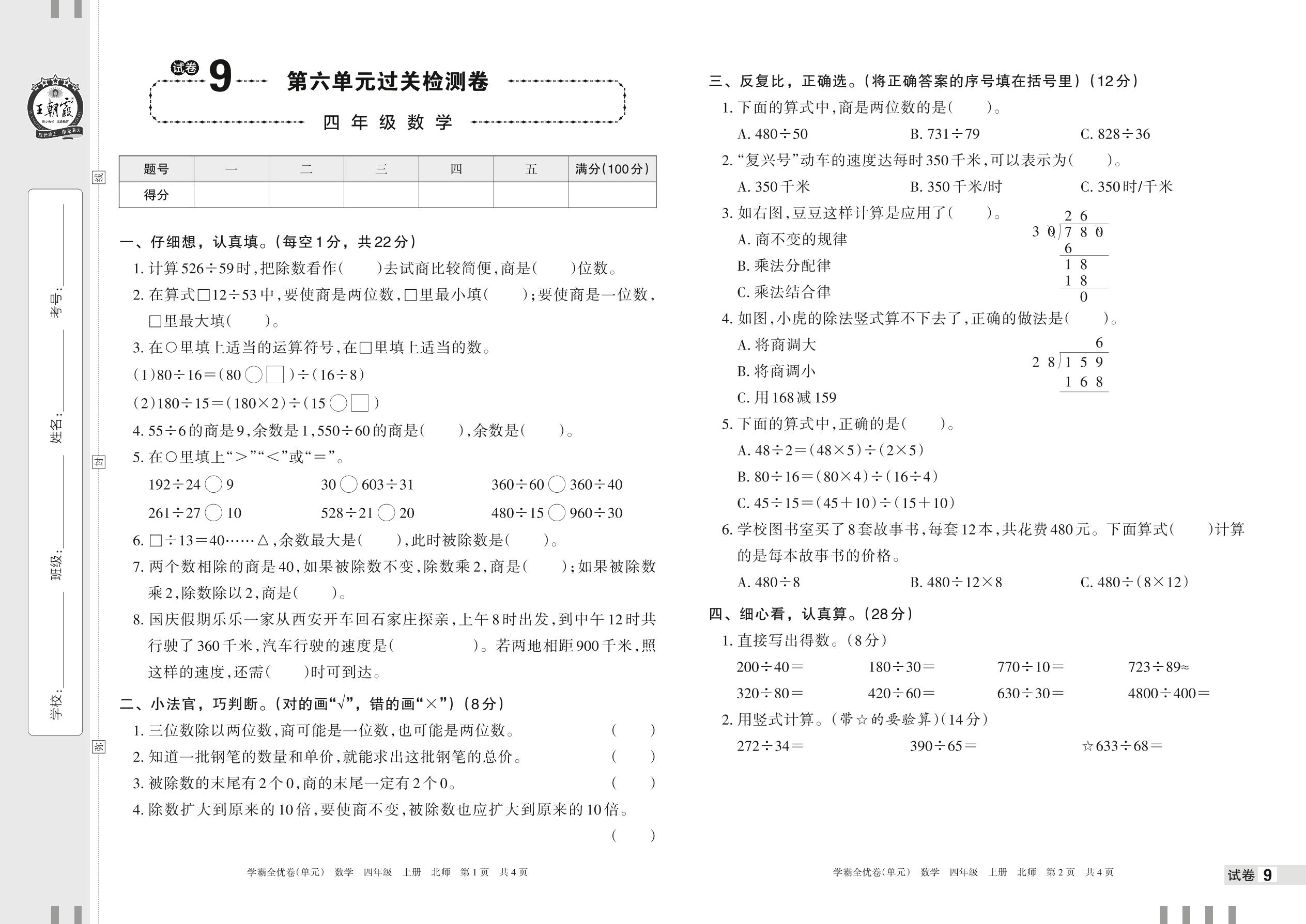2022上册四年级数学北师版 试卷9 第六单元过关检测卷