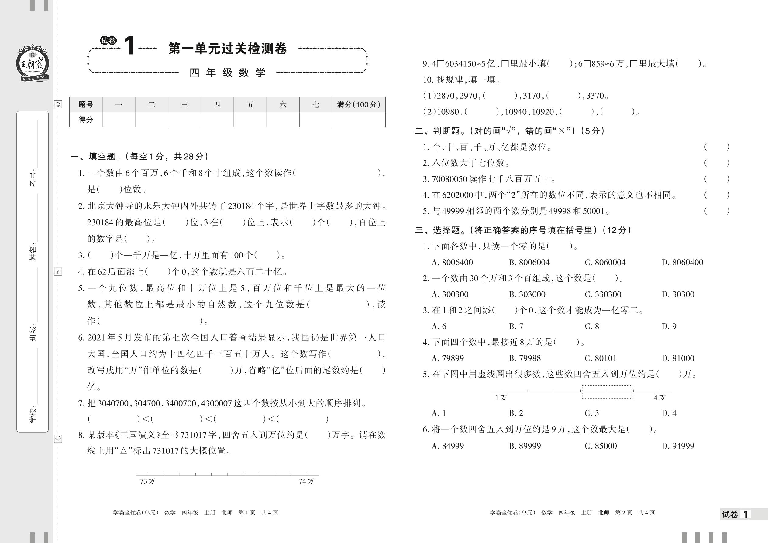 2022上册四年级数学北师版 试卷1 第一单元过关检测卷