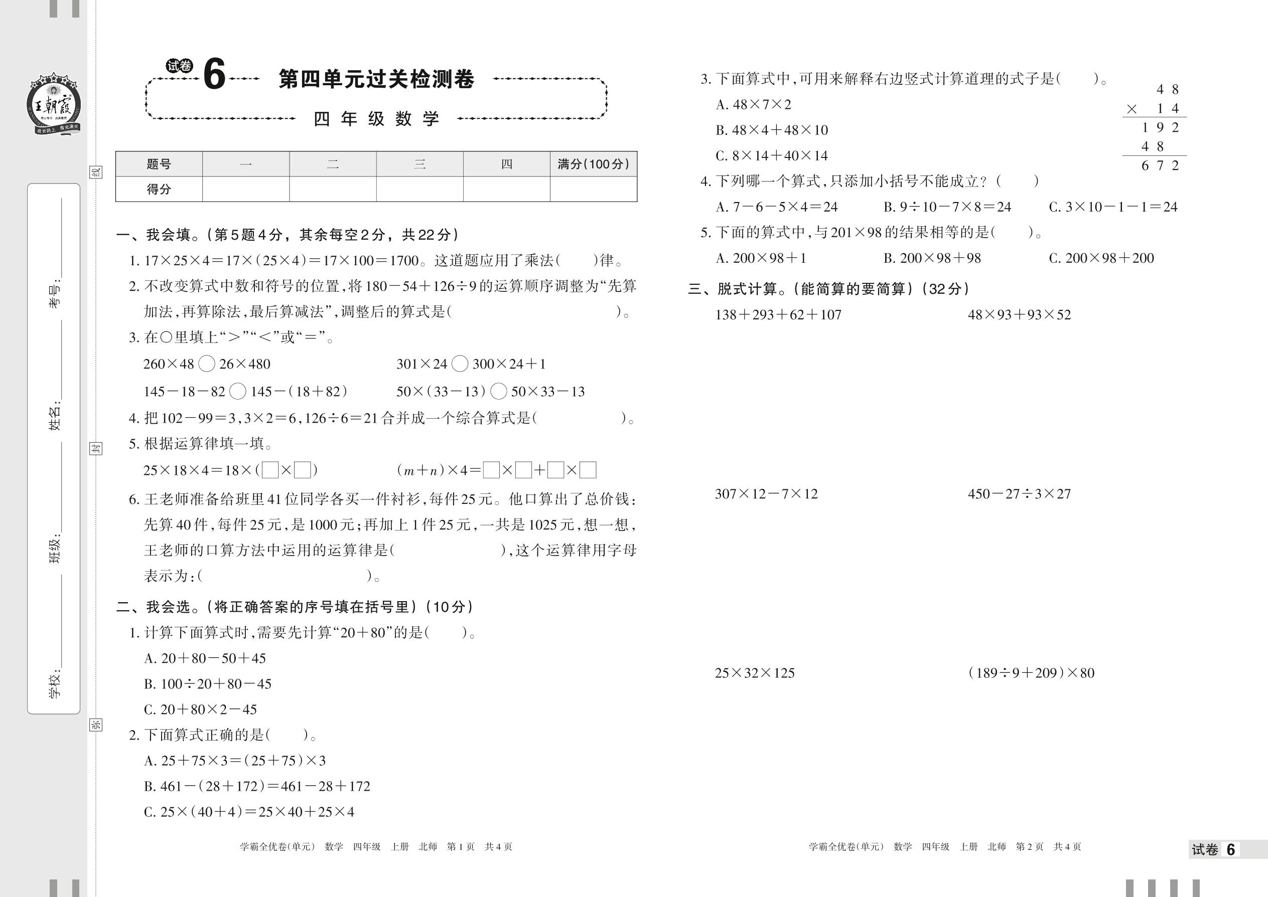 四年级数学北师版上册单元卷