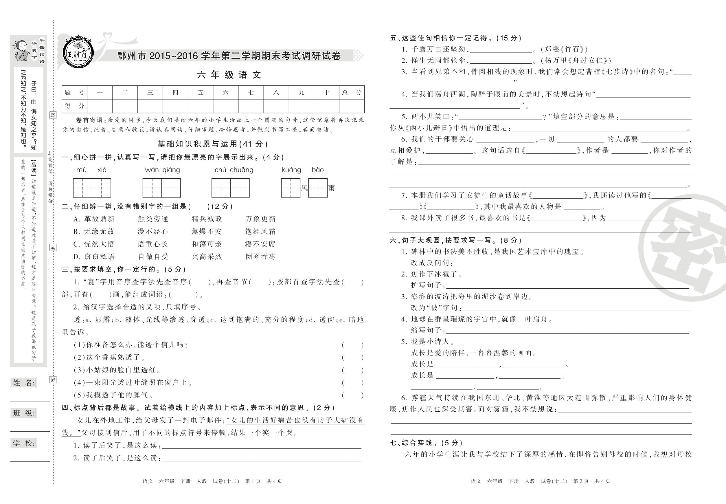 2015-2016学年第二学期鄂州市六年级语文试卷(人教版)【12】