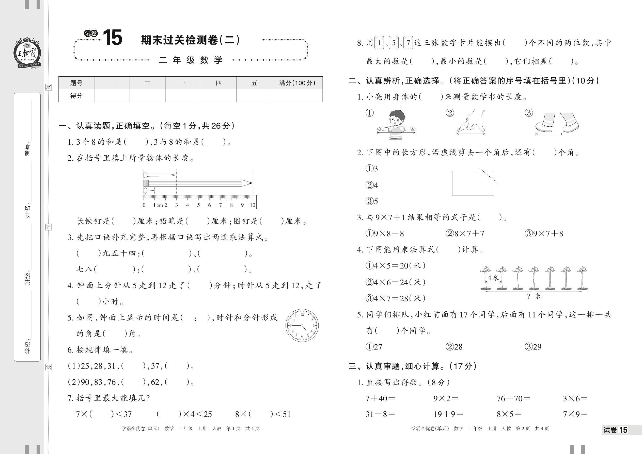 2022上册二年级数学人教版 试卷15 期末过关检测卷(二)