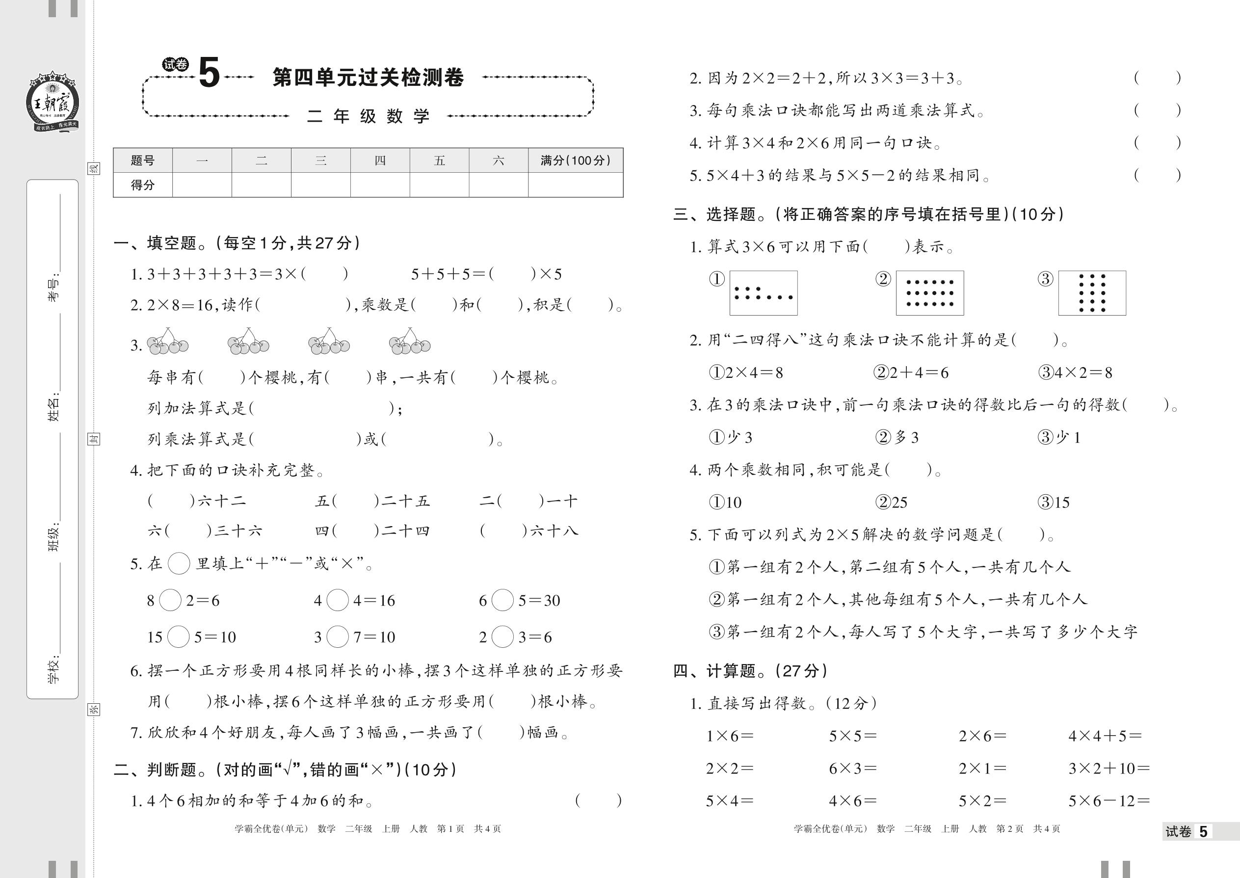 2022上册二年级数学人教版 试卷5 第四单元过关检测卷
