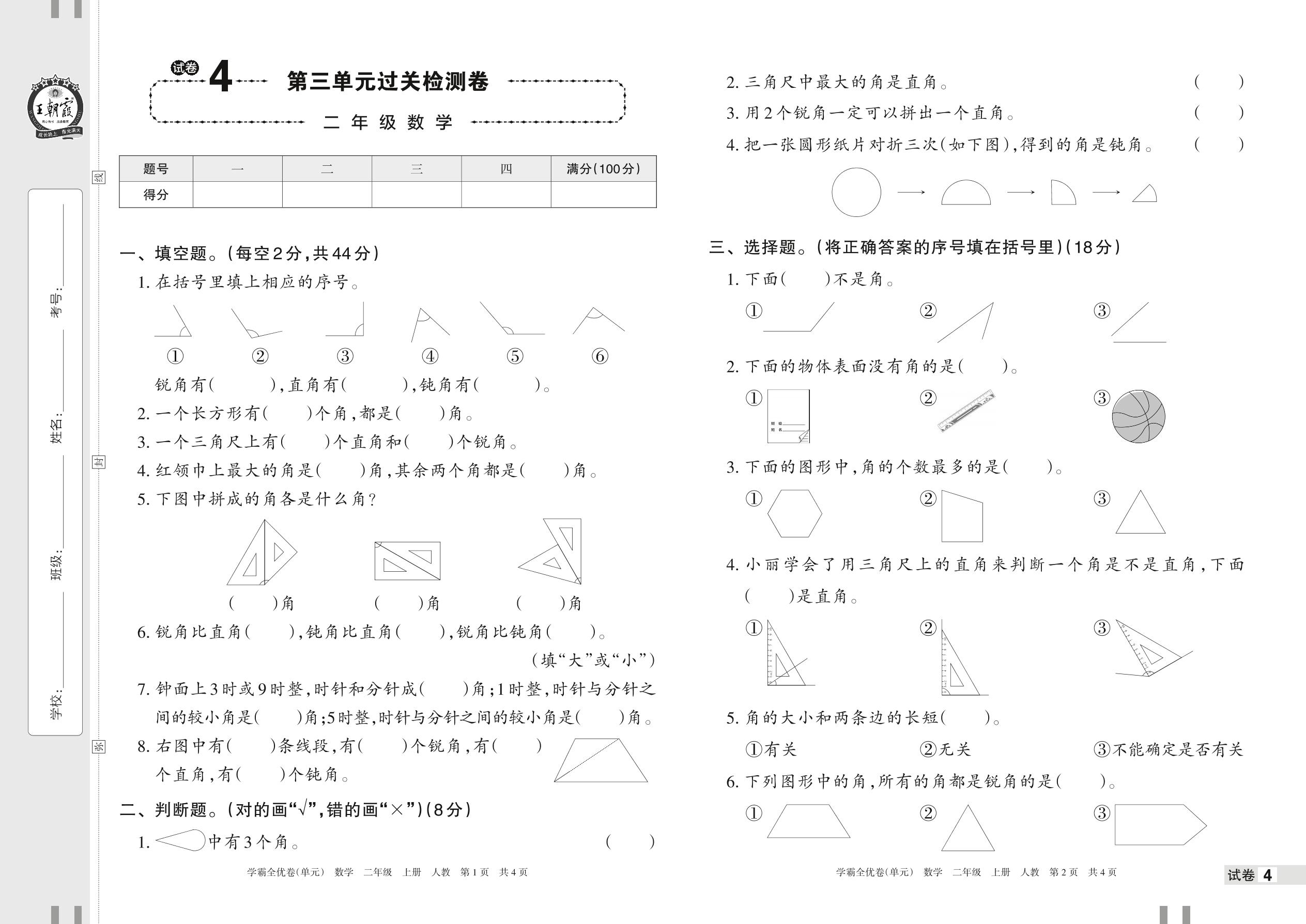 2022上册二年级数学人教版 试卷4 第三单元过关检测卷