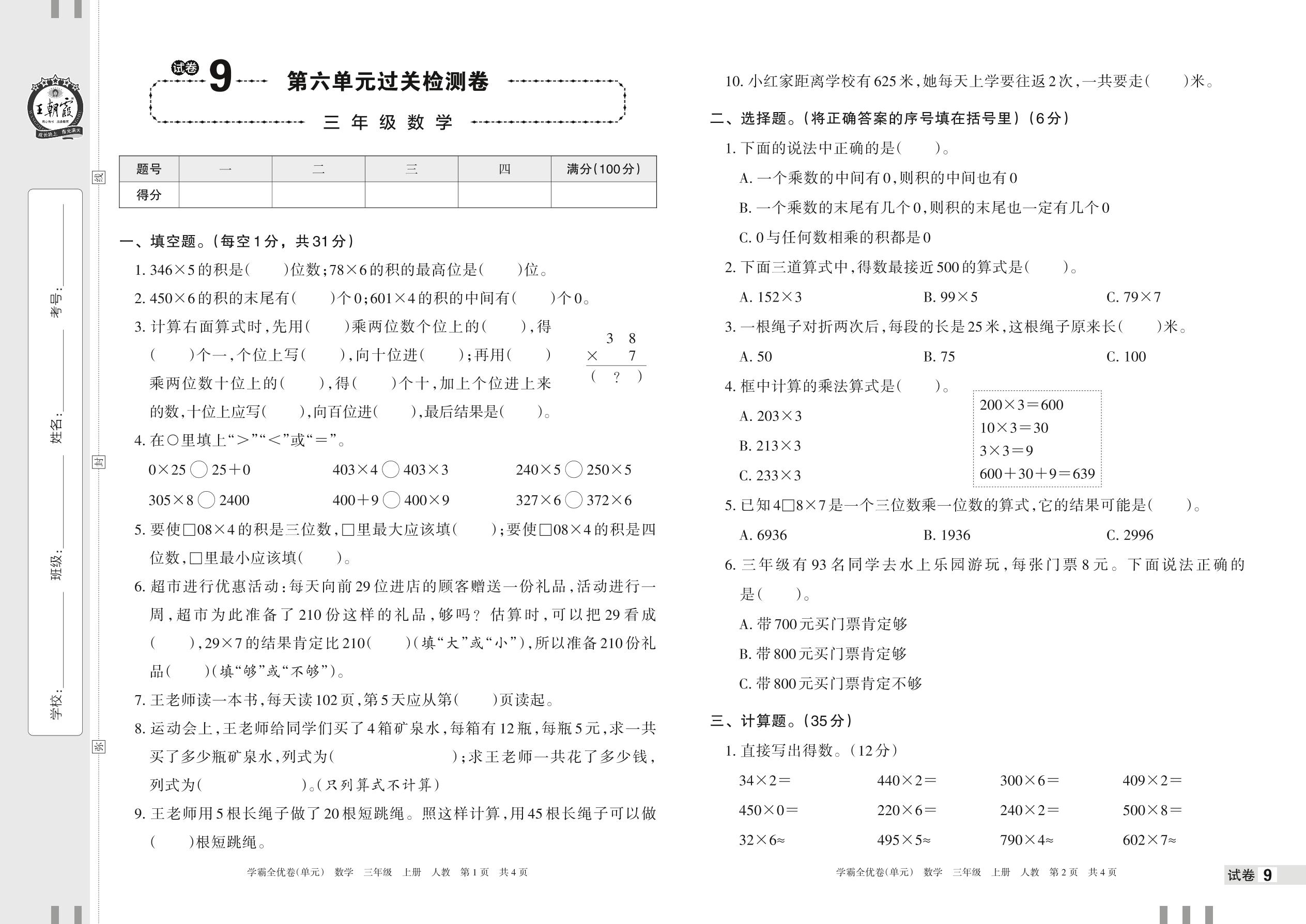 2022上册三年级数学人教版 试卷9 第六单元过关检测卷