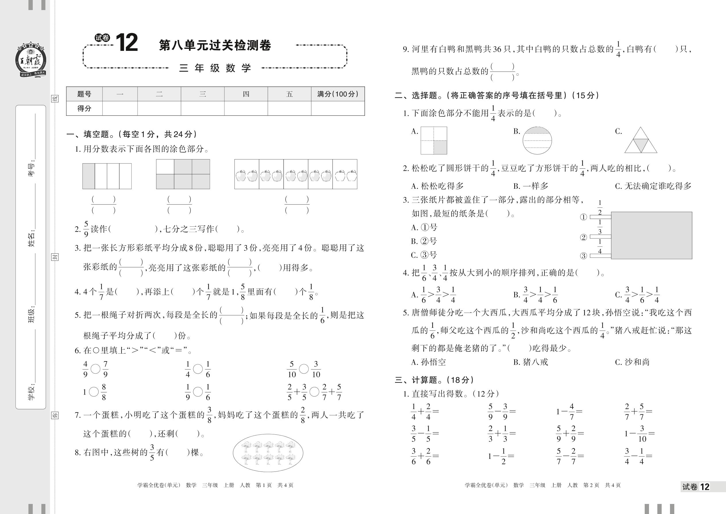 2022上册三年级数学人教版 试卷12 第八单元过关检测卷