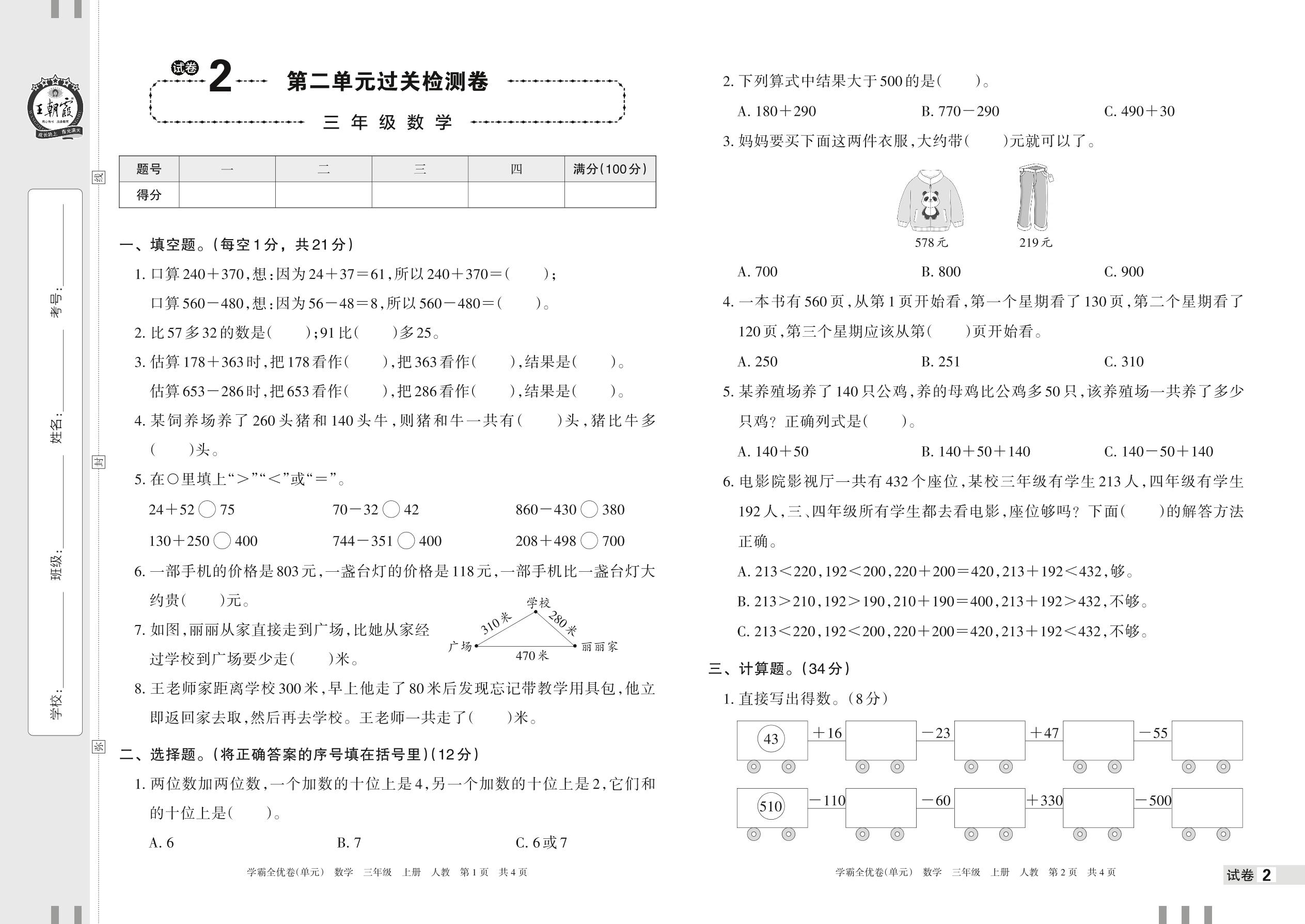 2022上册三年级数学人教版 试卷2 第二单元过关检测卷