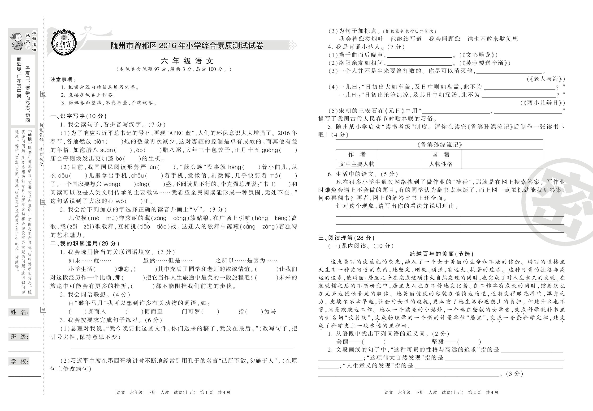 2015-2016学年第二学期随州市曾都区六年级语文试卷(人教版)【15】