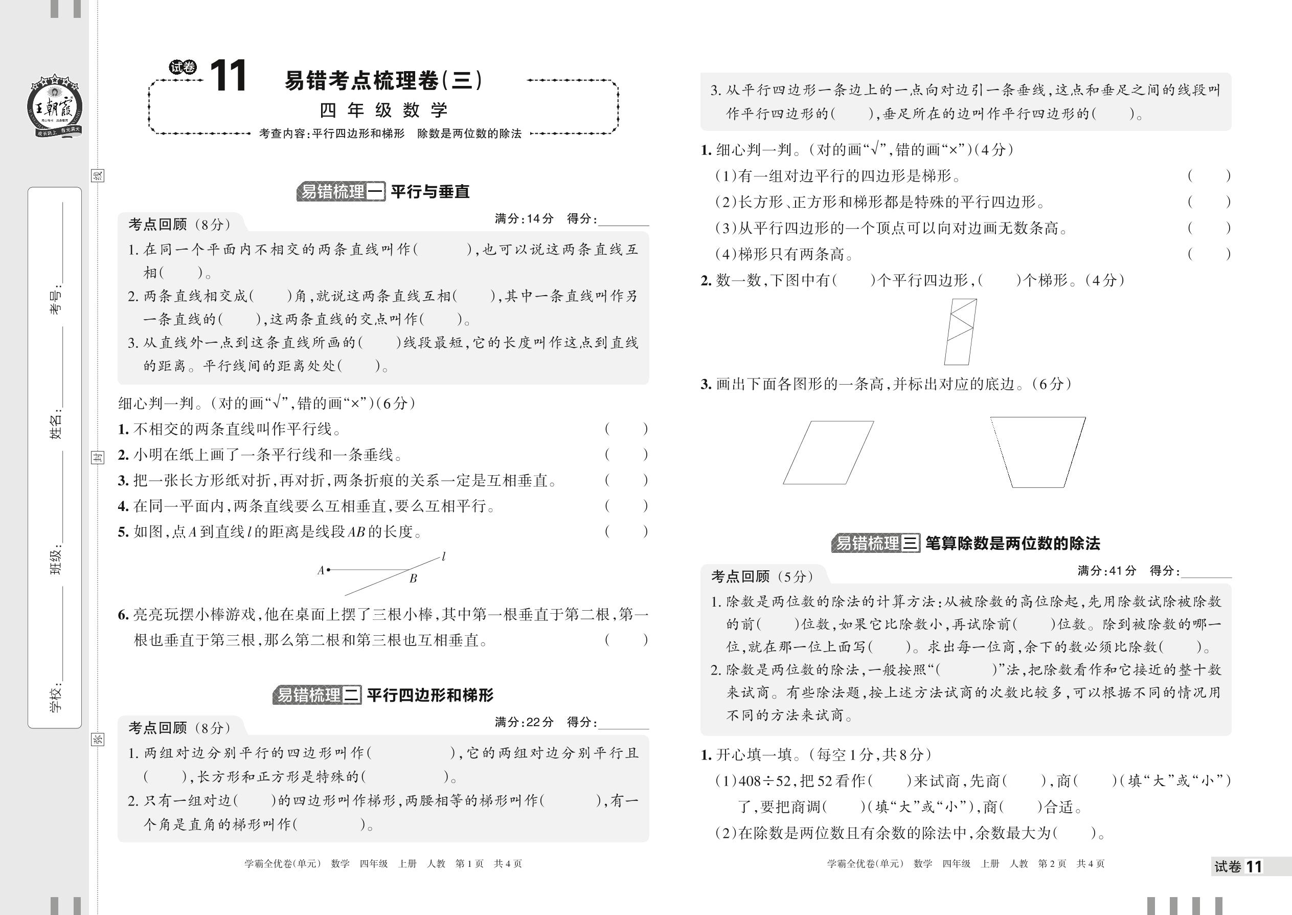 2022上册四年级数学人教版 试卷11 易错考点梳理卷(三)