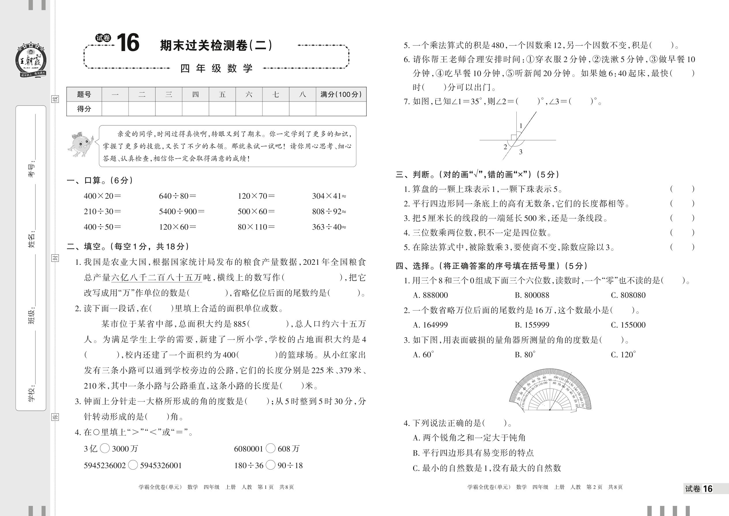 2022上册四年级数学人教版 试卷16 期末过关检测卷(二)