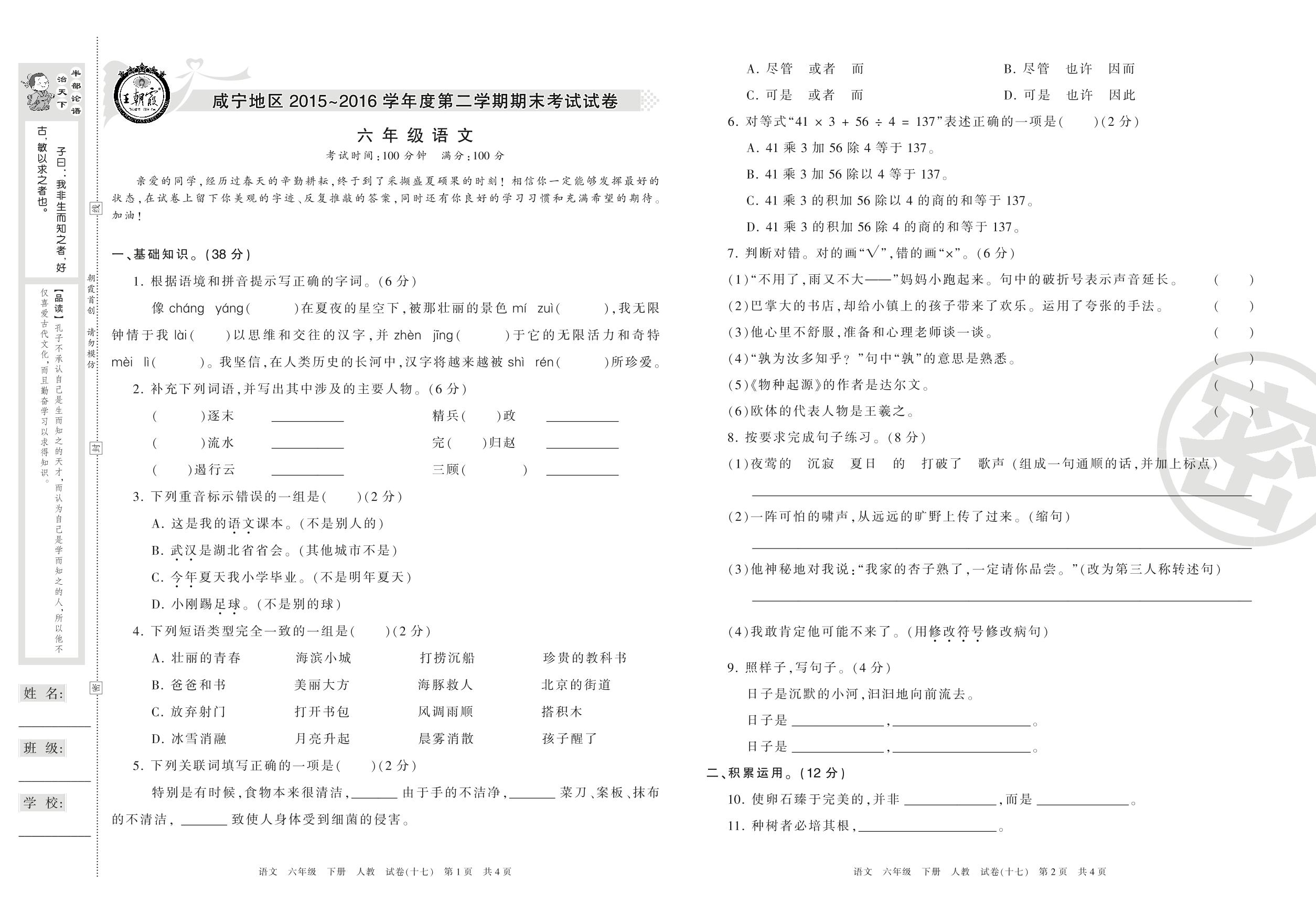 2015-2016学年第二学期咸宁市咸宁地区六年级语文试卷(人教版)【17】