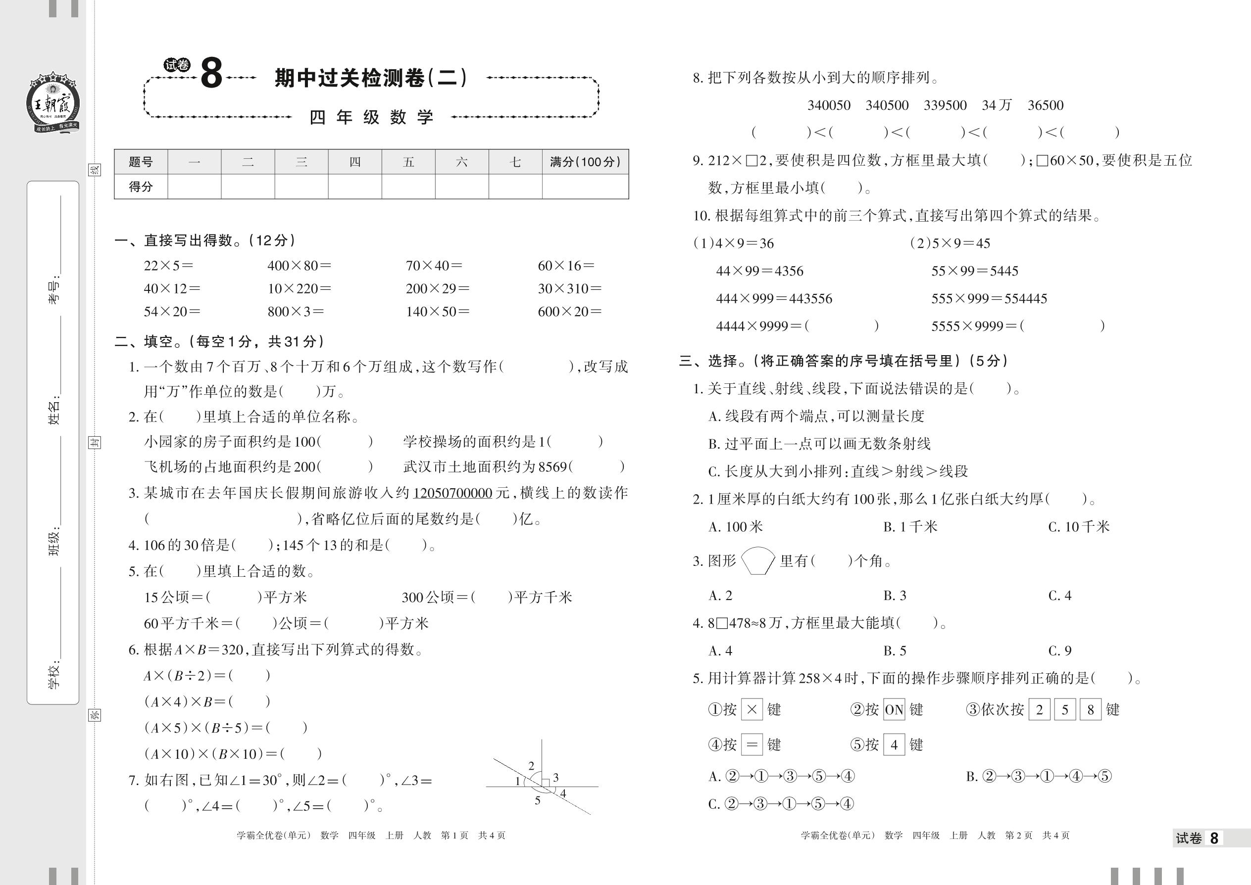 2022上册四年级数学人教版 试卷8 期中过关检测卷(二)