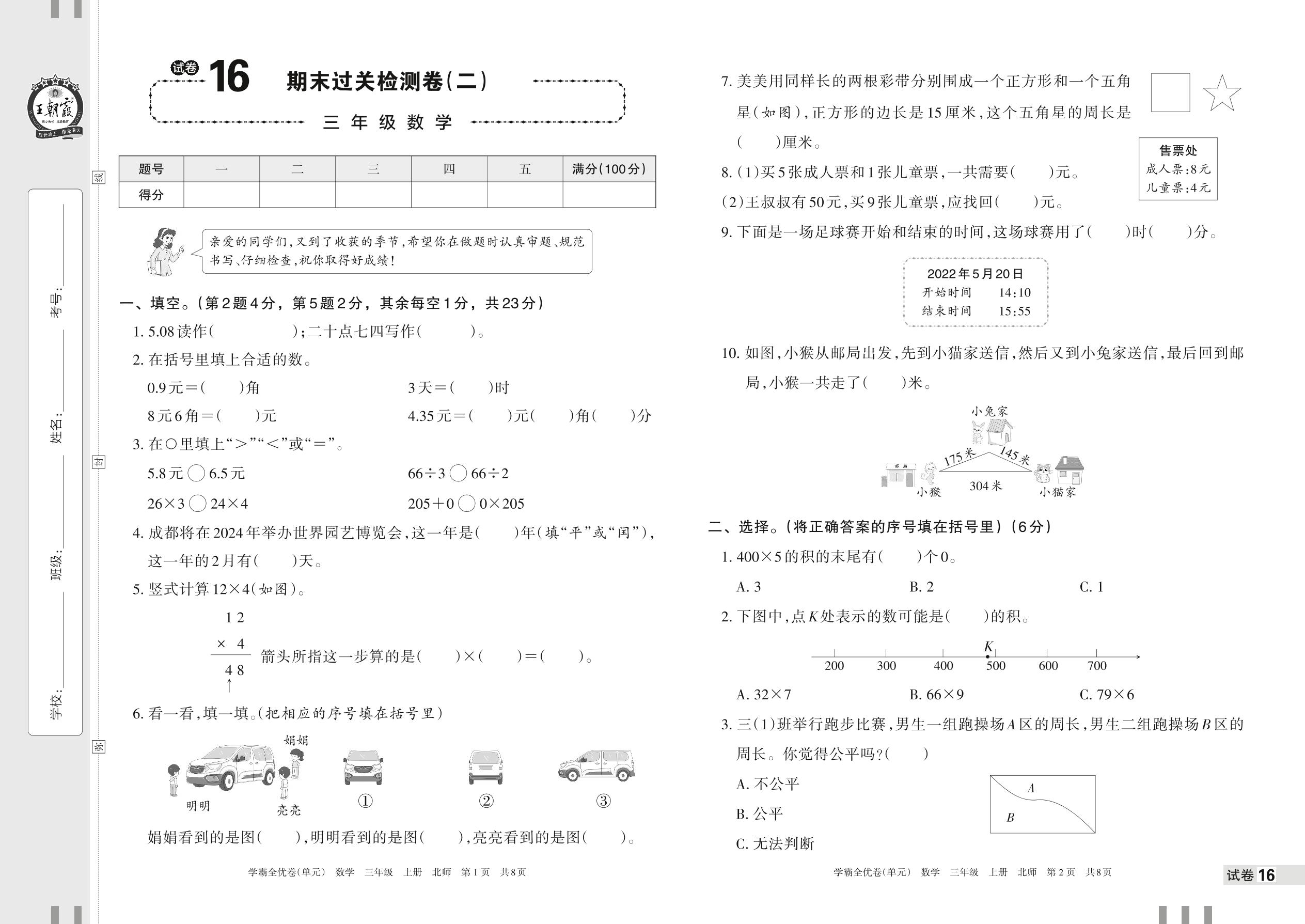 2022上册三年级数学北师版 试卷16 期末过关检测卷(二)