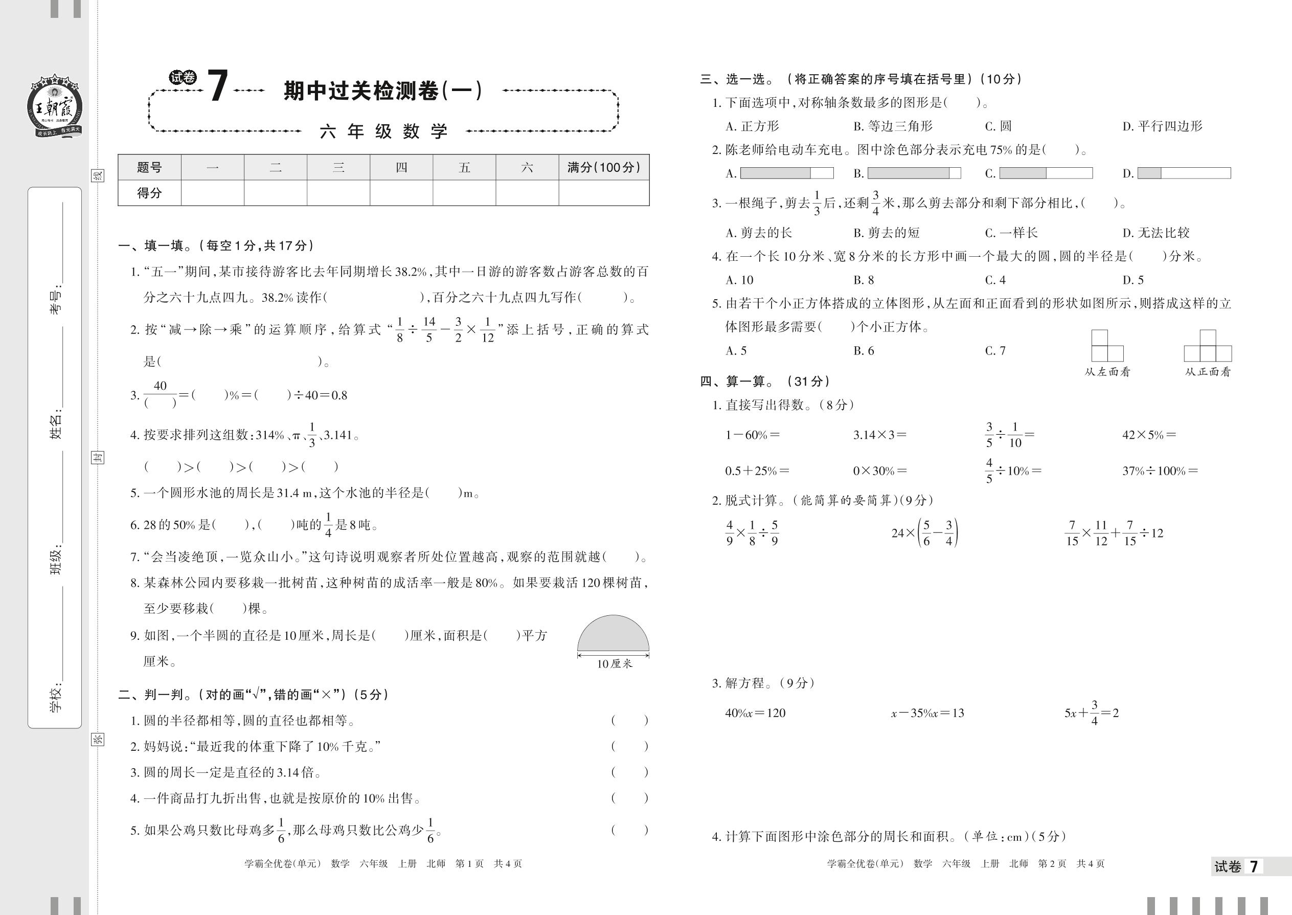 2022上册六年级数学北师版 试卷7 期中过关检测卷(一)