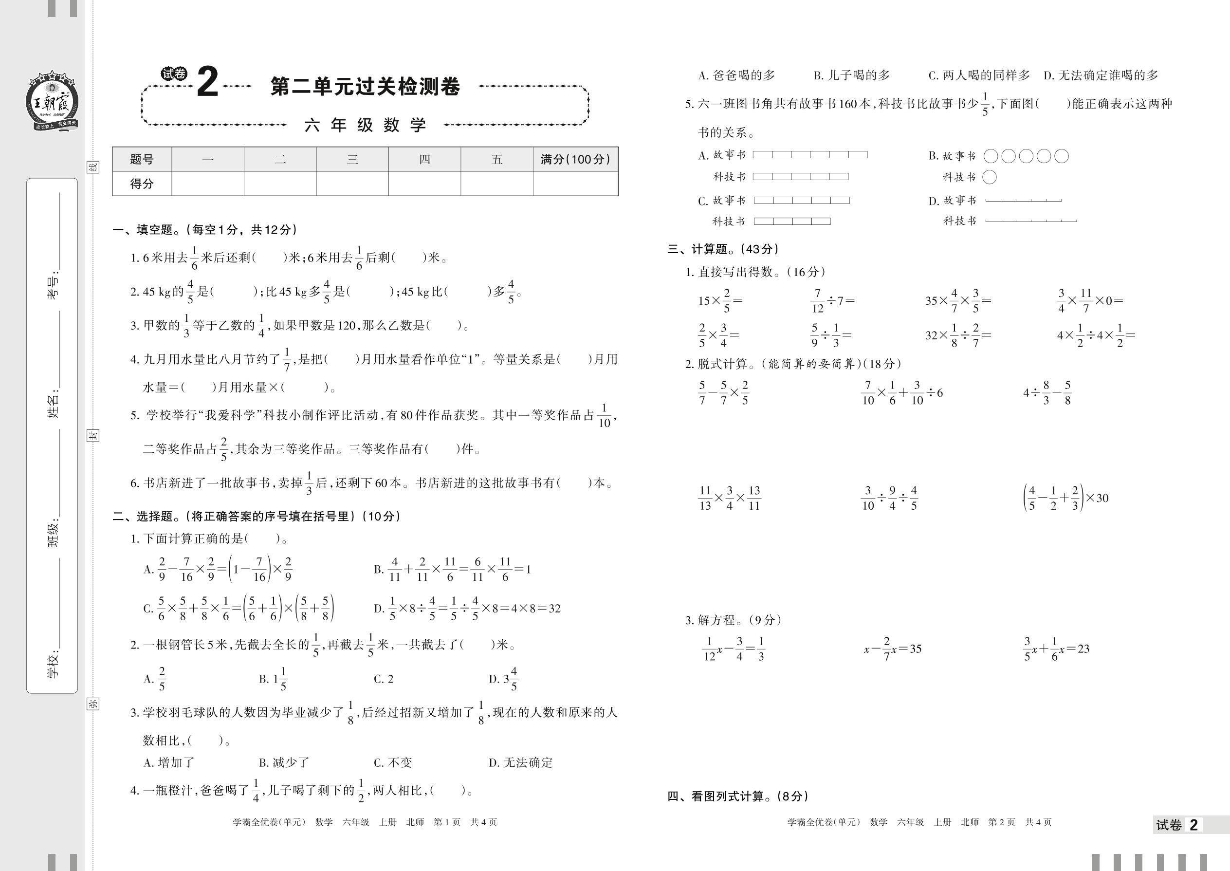 2022上册六年级数学北师版 试卷2 第二单元过关检测卷