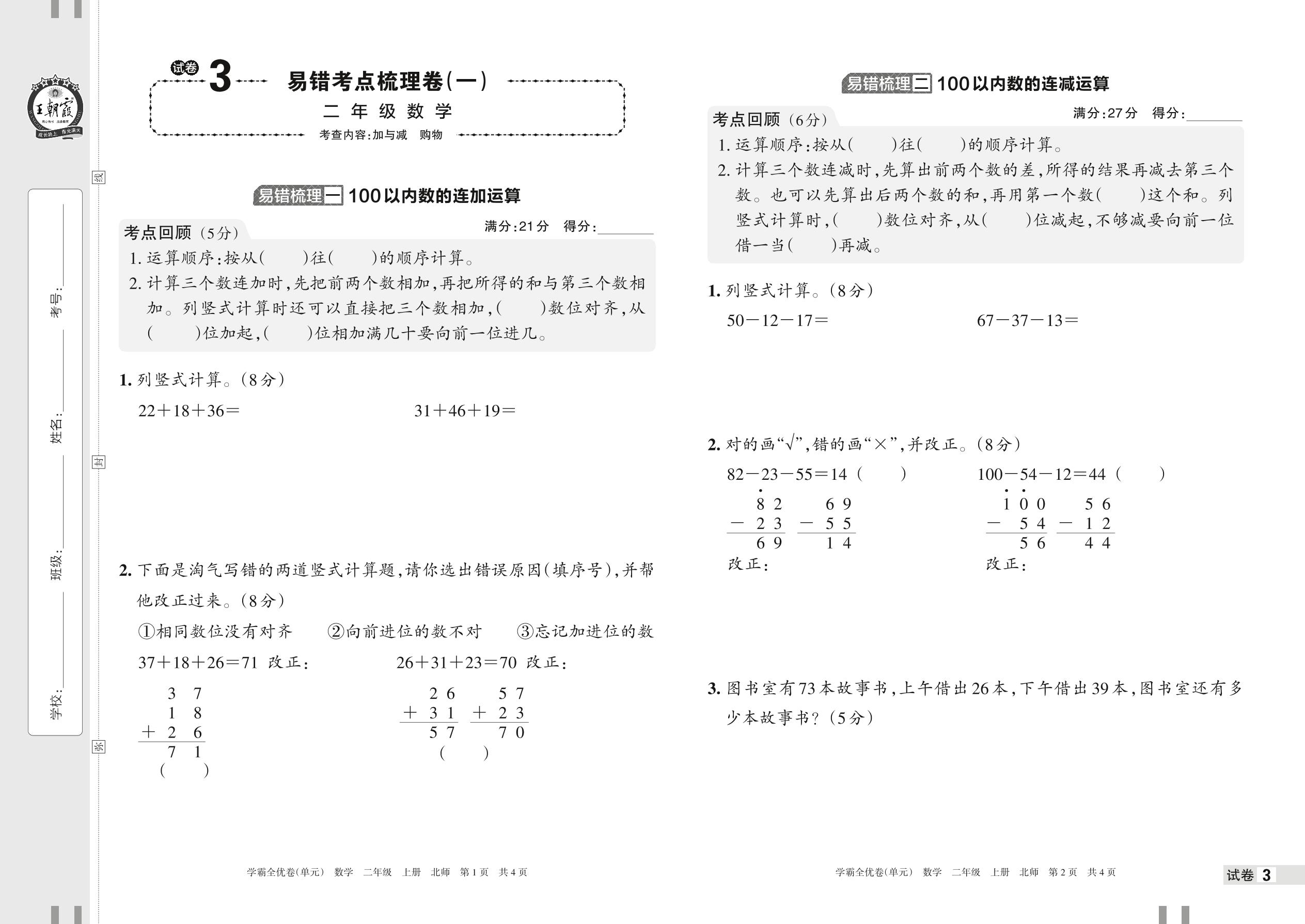 2022上册二年级数学北师版 试卷3 易错考点梳理卷(一)