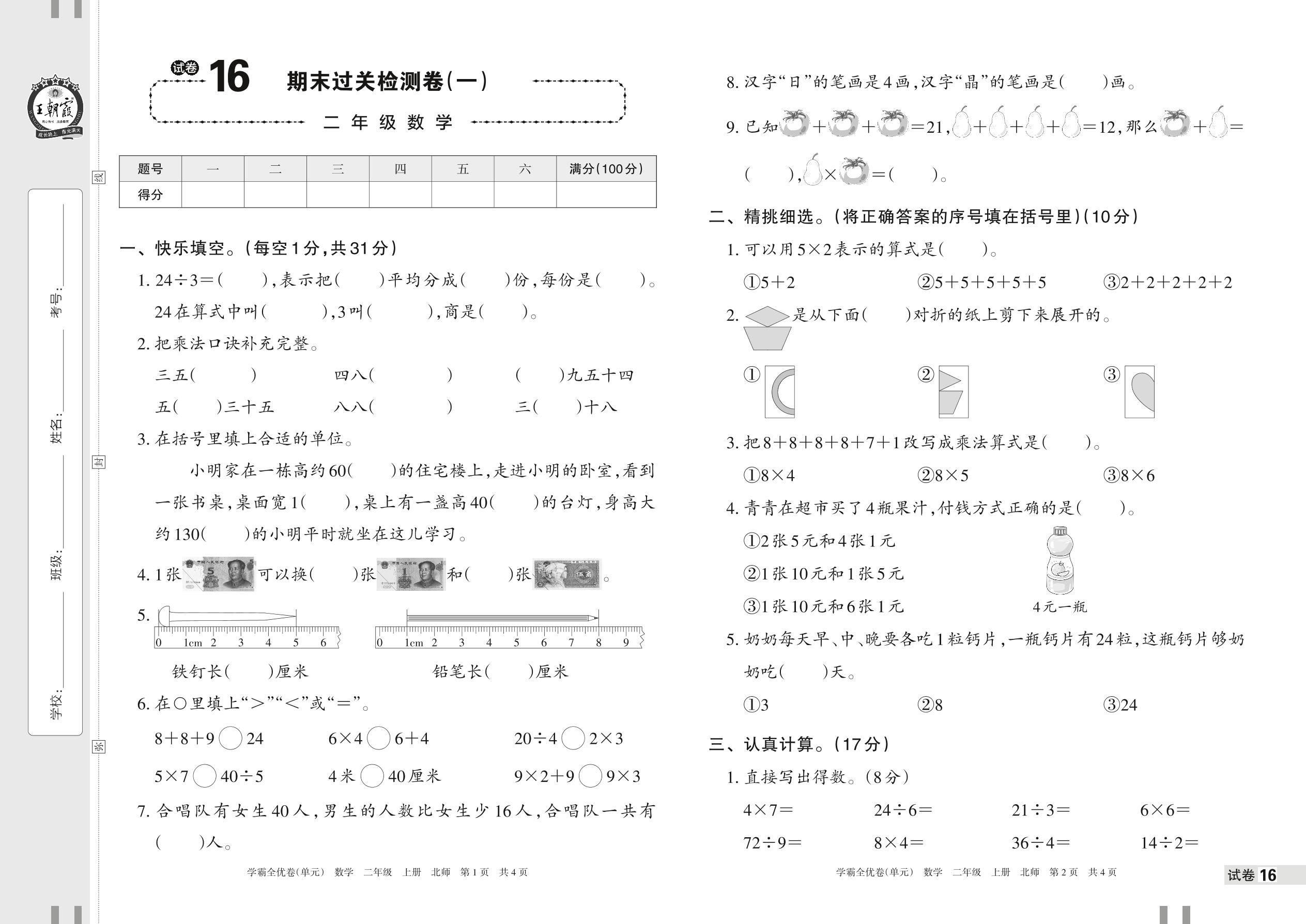 2022上册二年级数学北师版 试卷16 期末过关检测卷(一)