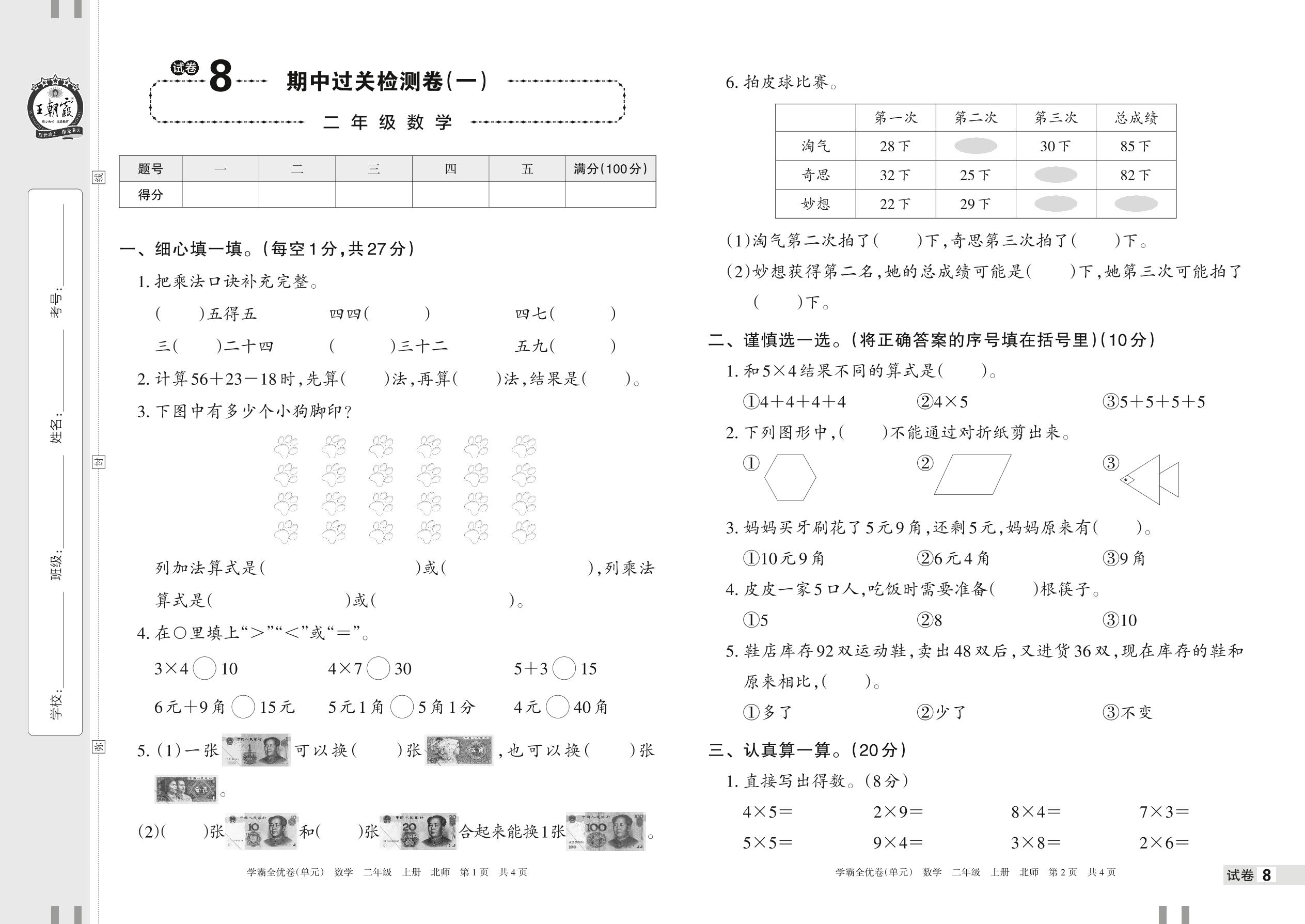 2022上册二年级数学北师版 试卷8 期中过关检测卷(一)