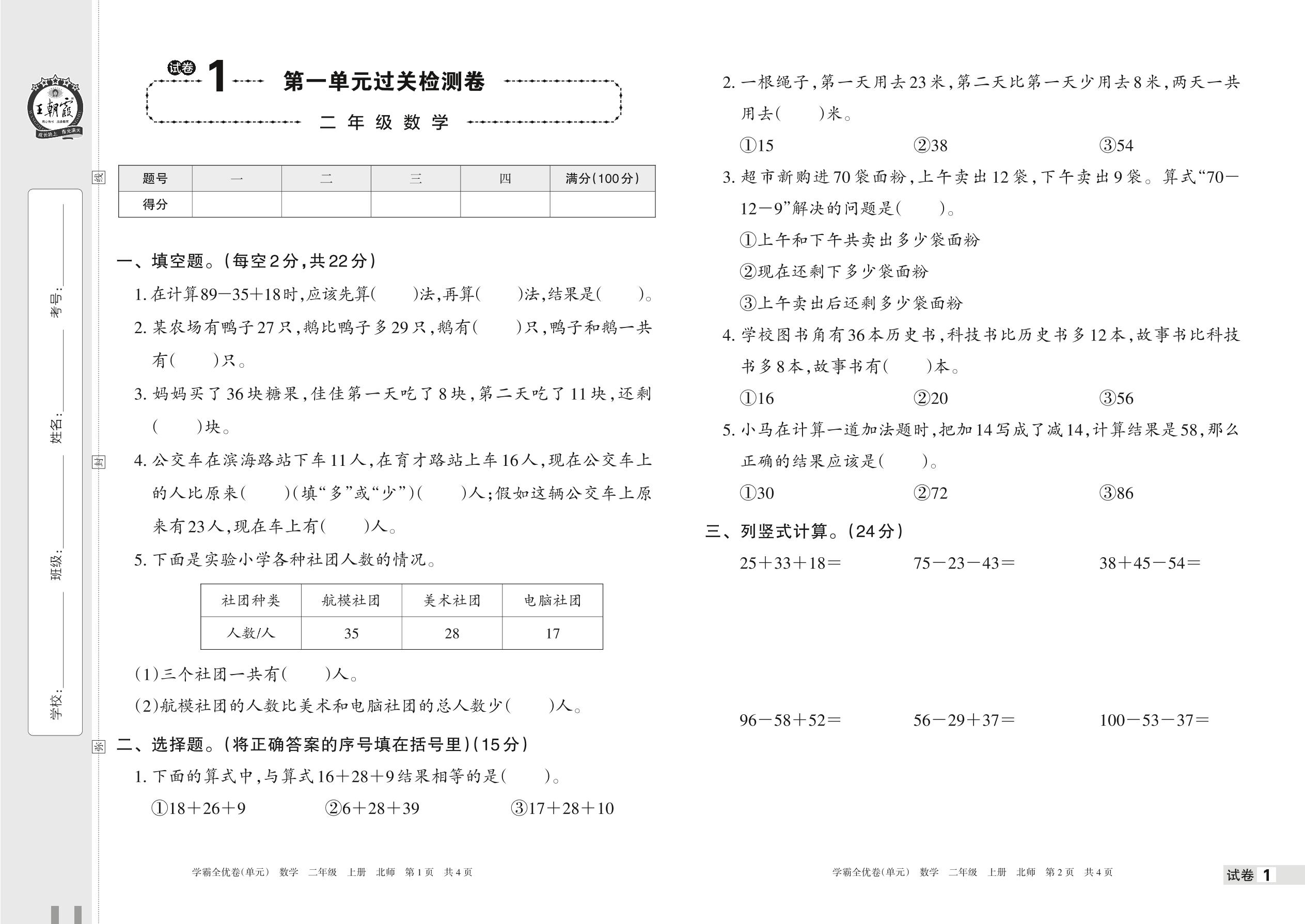2022上册二年级数学北师版 试卷1 第一单元过关检测卷