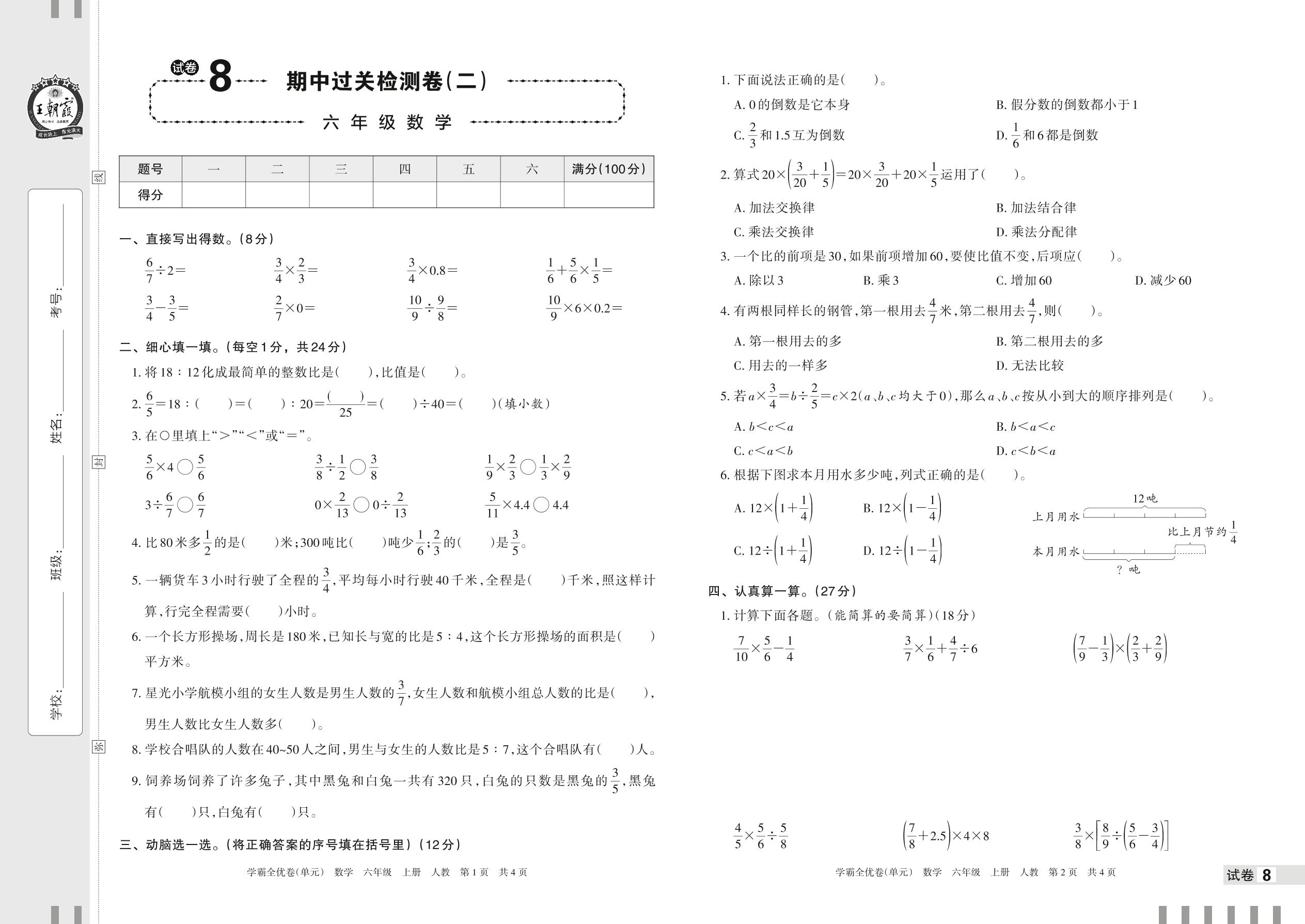 2022上册六年级数学人教版 试卷8 期中过关检测卷(二)
