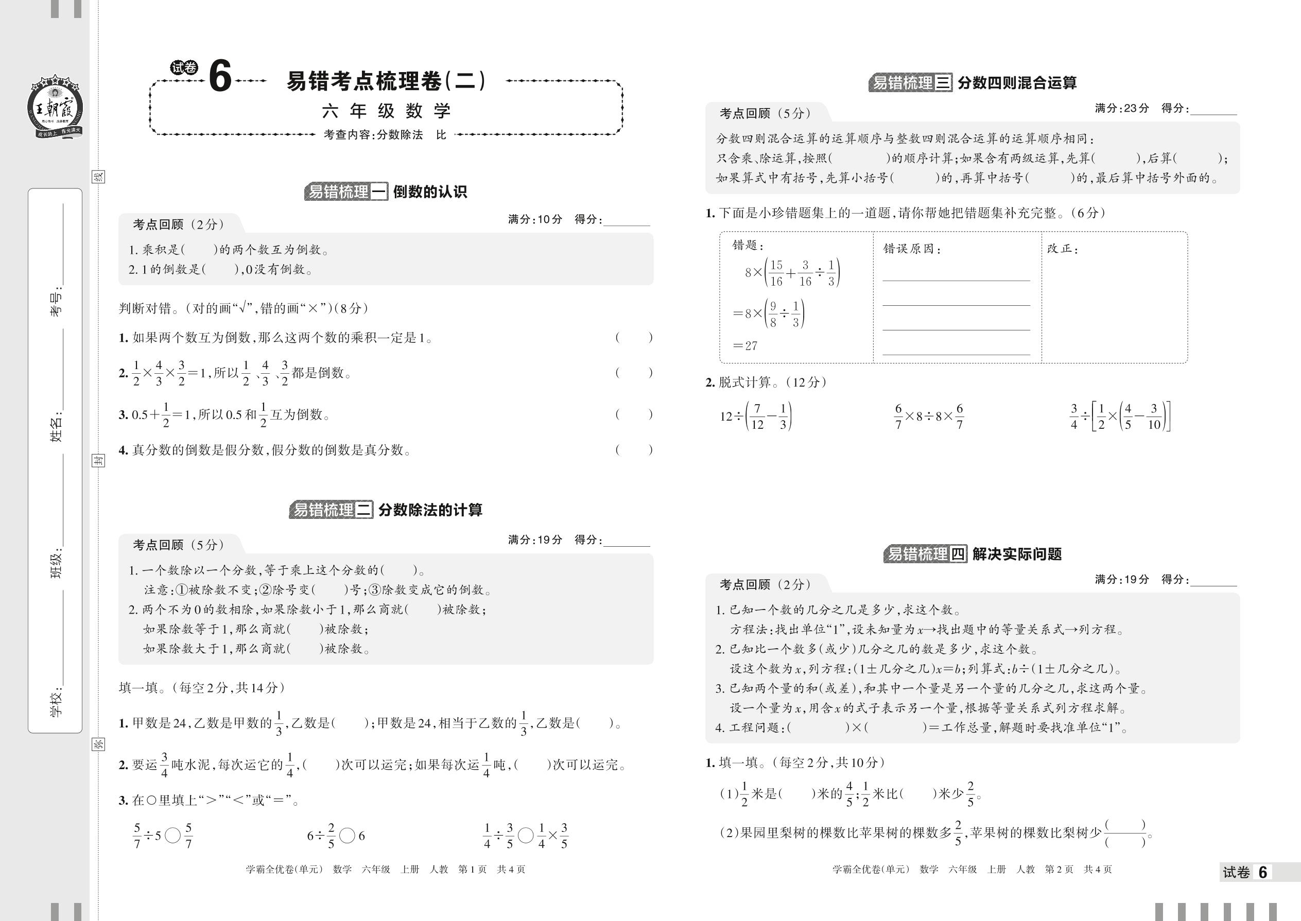 2022上册六年级数学人教版 试卷6 易错考点梳理卷(二)