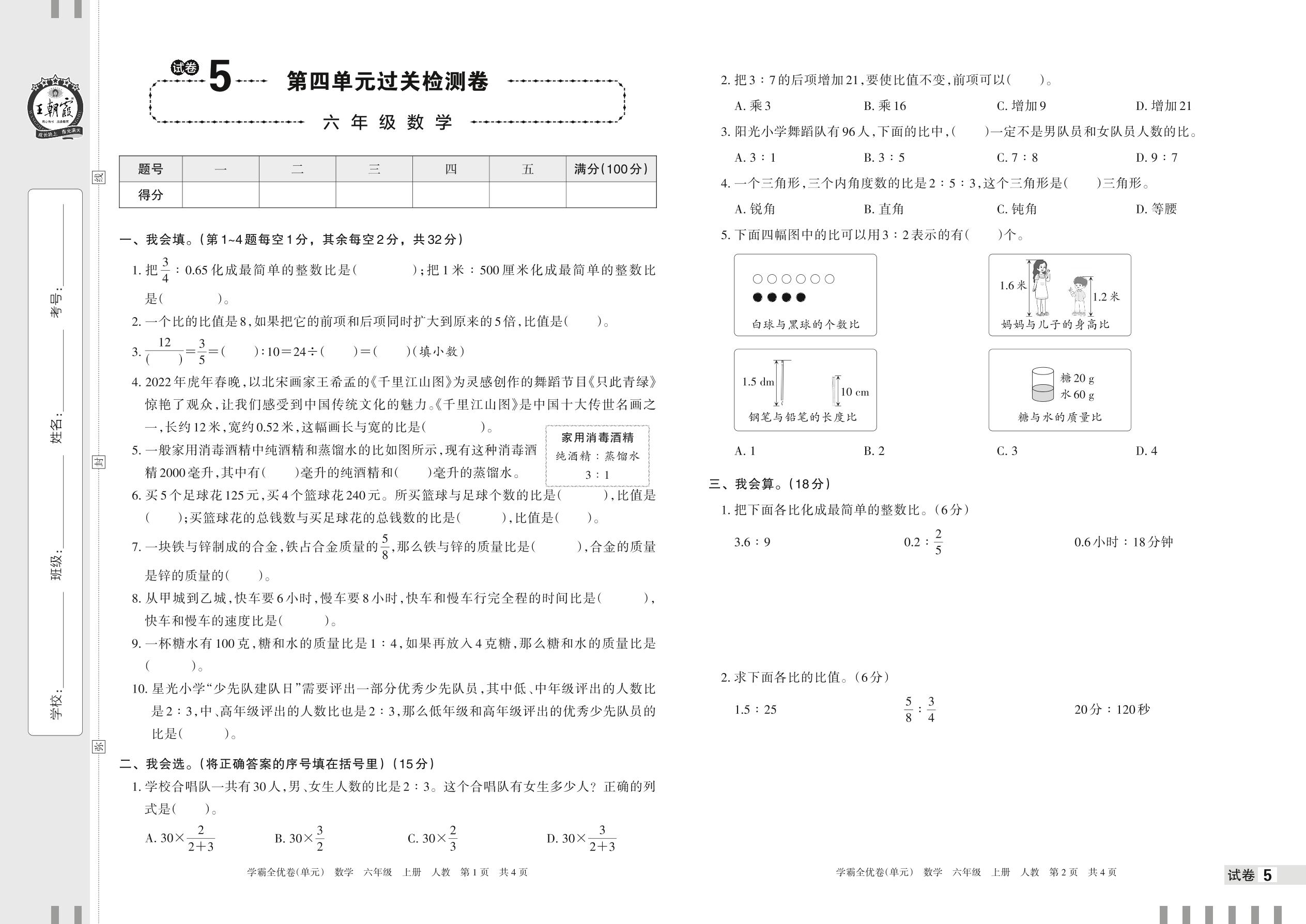 2022上册六年级数学人教版 试卷5 第四单元过关检测卷