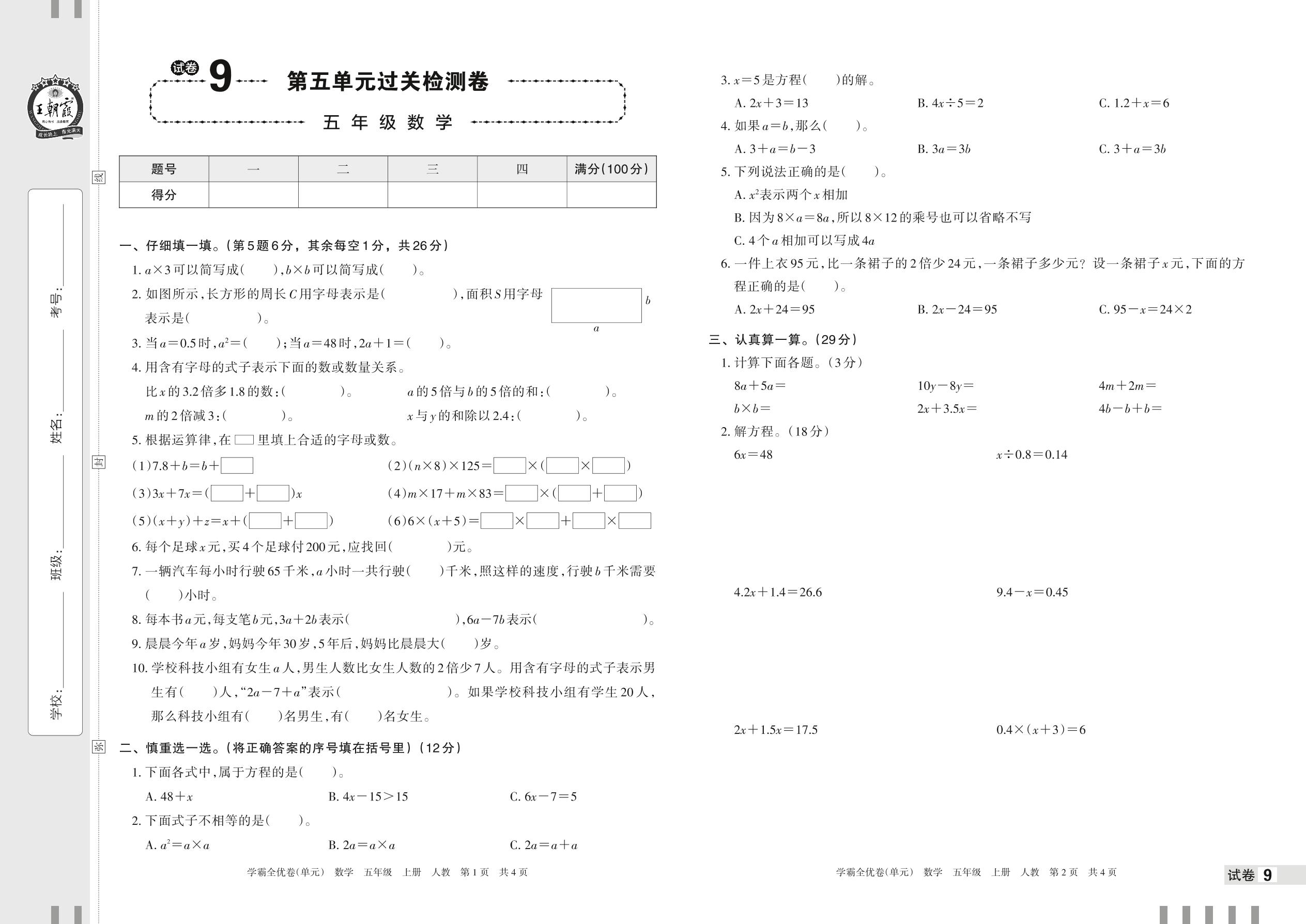 2022上册五年级数学人教版 试卷9 第五单元过关检测卷
