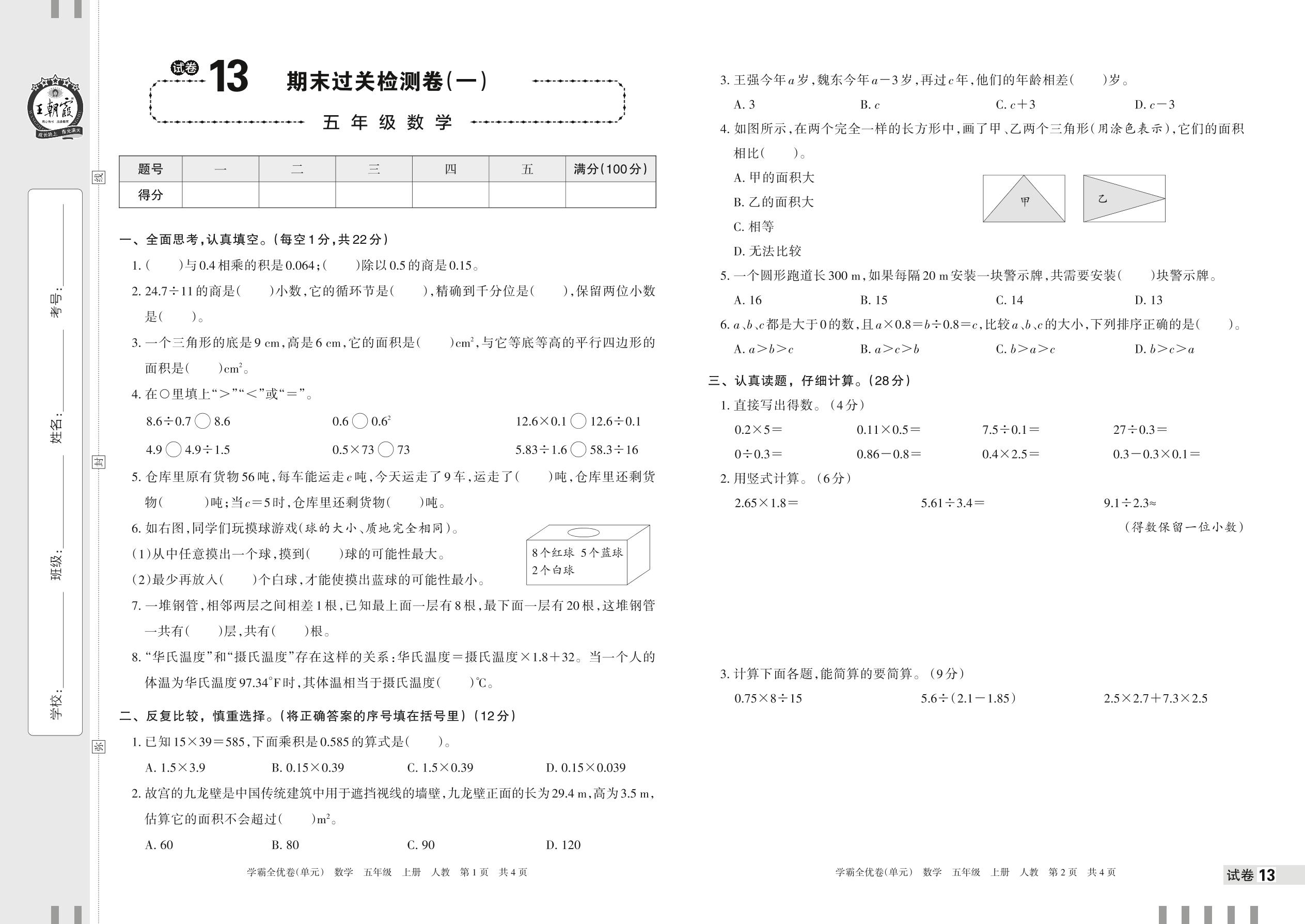 2022上册五年级数学人教版 试卷13 期末过关检测卷(一)