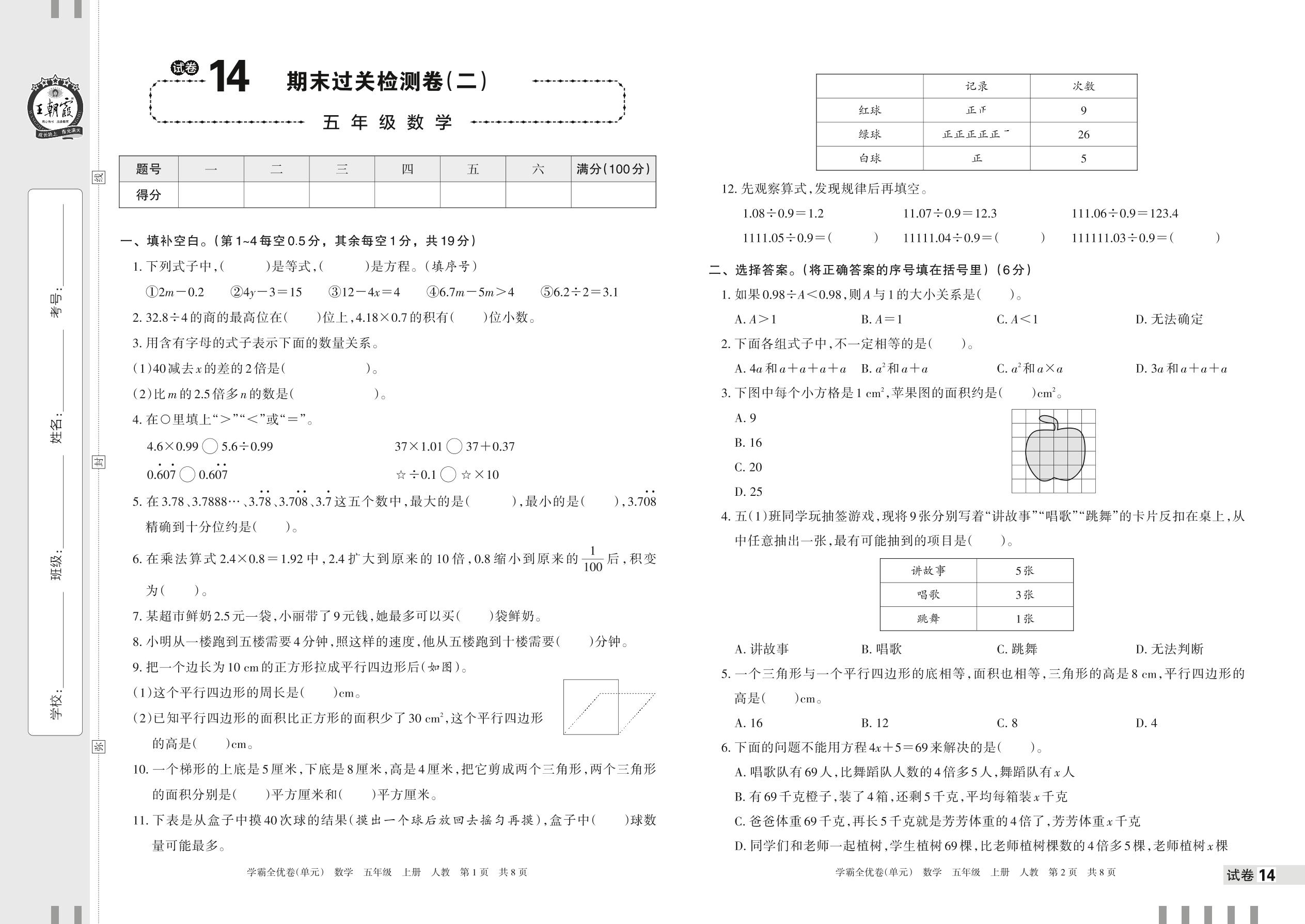 2022上册五年级数学人教版 试卷14 期末过关检测卷(二)