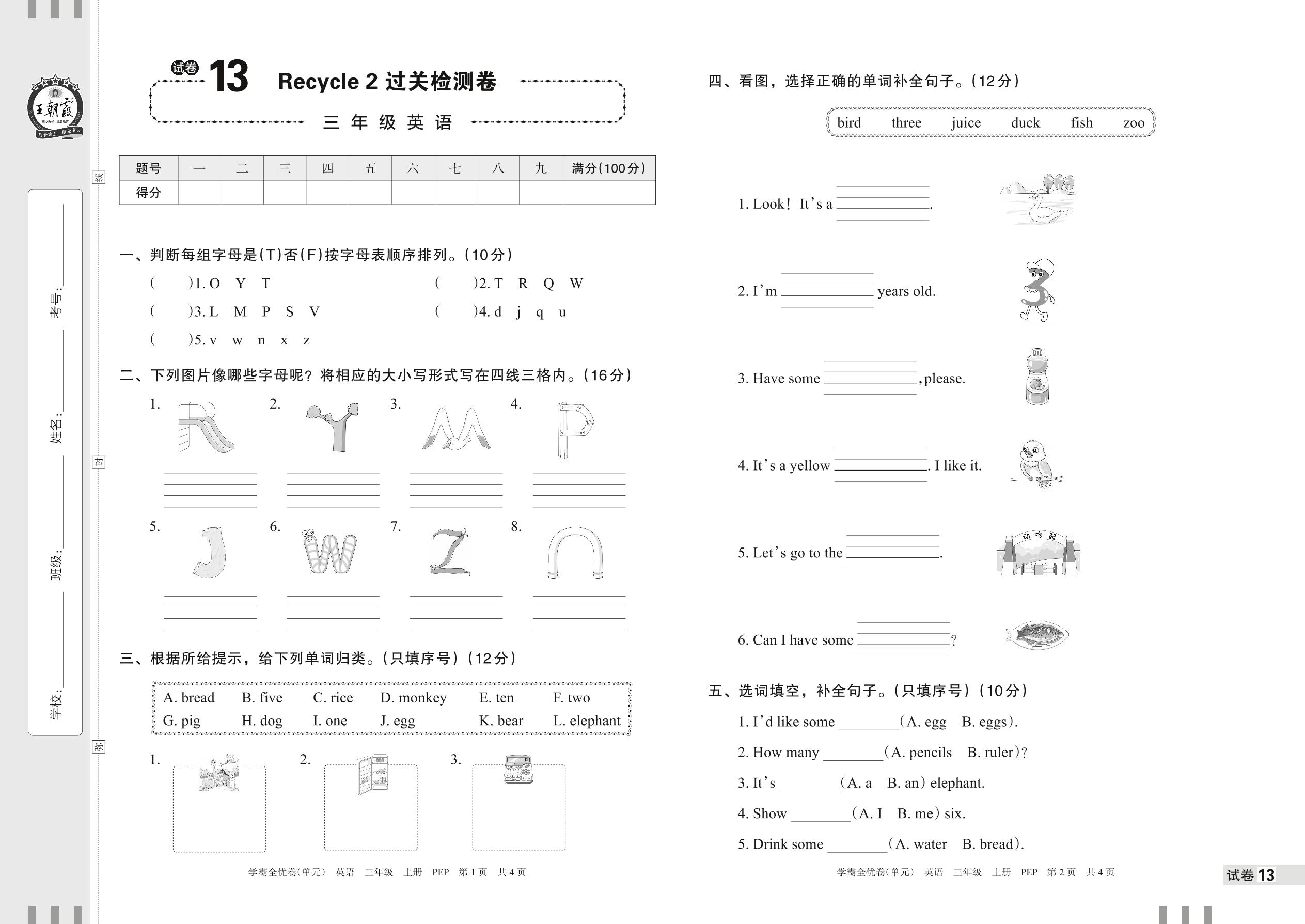 2022上册三年级英语人教PEP版 试卷13 Recycle 2 过关检测卷