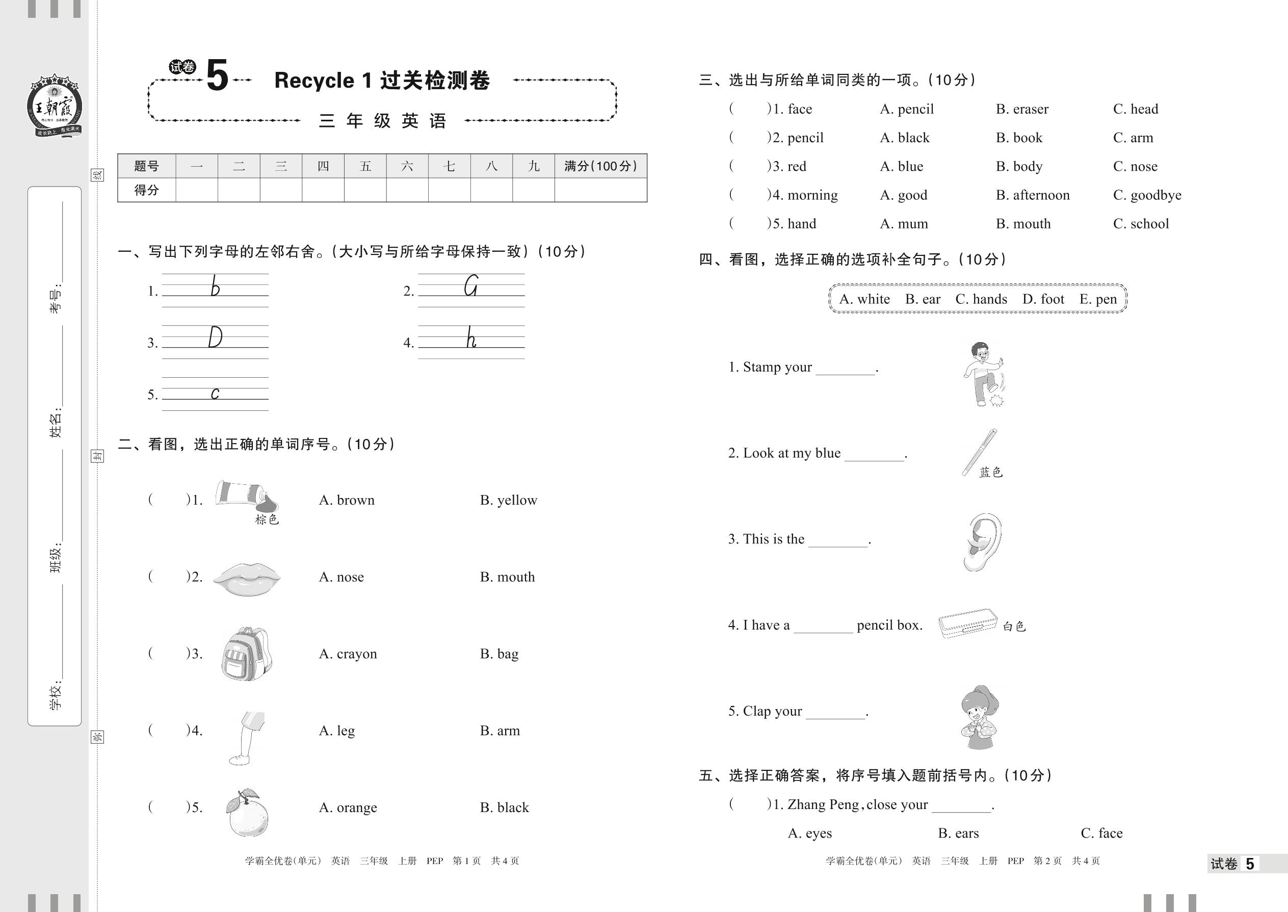 三年级英语人教PEP版(三起始)上册单元卷