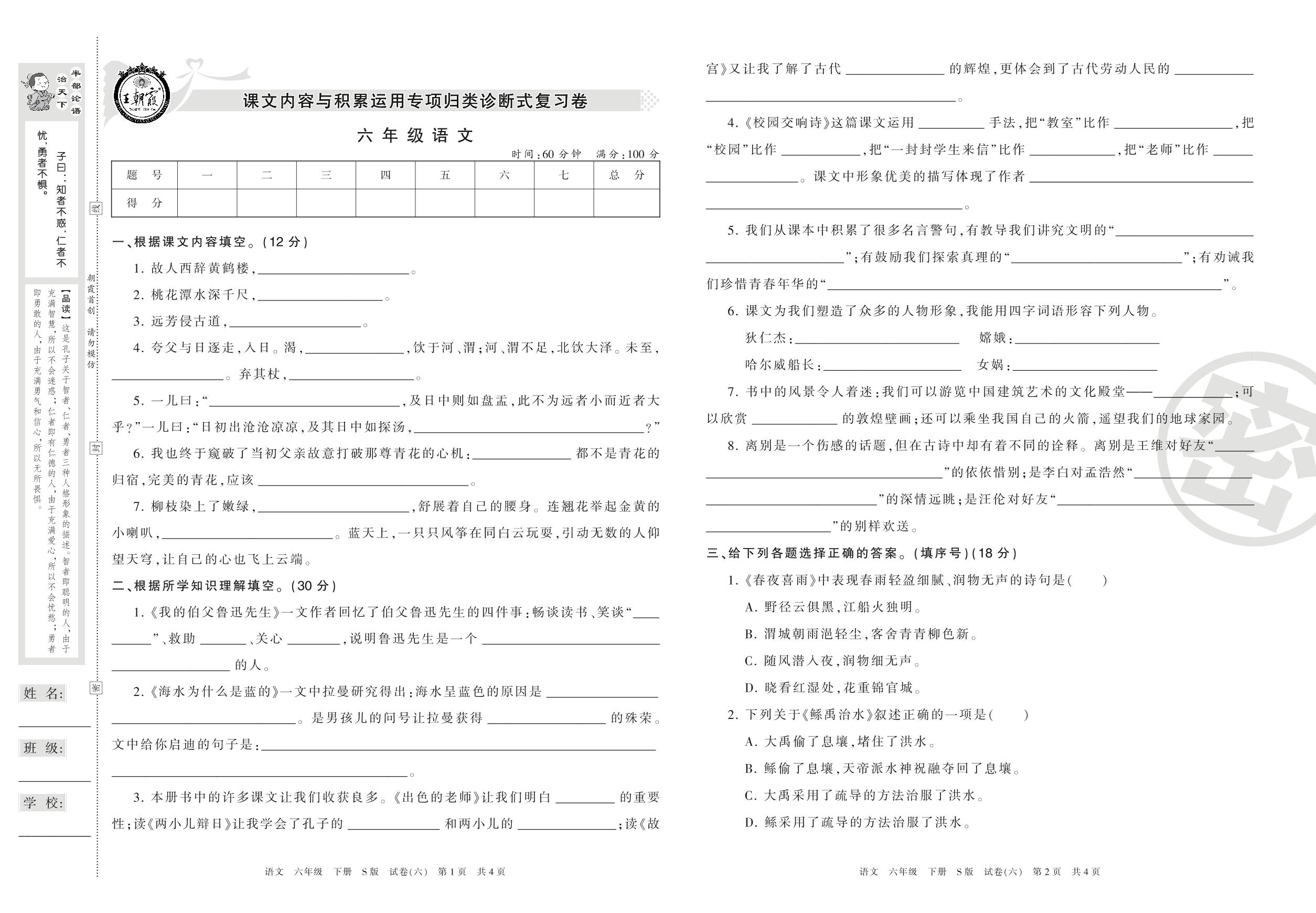 王朝霞期末专项卷六年级下册语文(S版)_R21080290135【6】