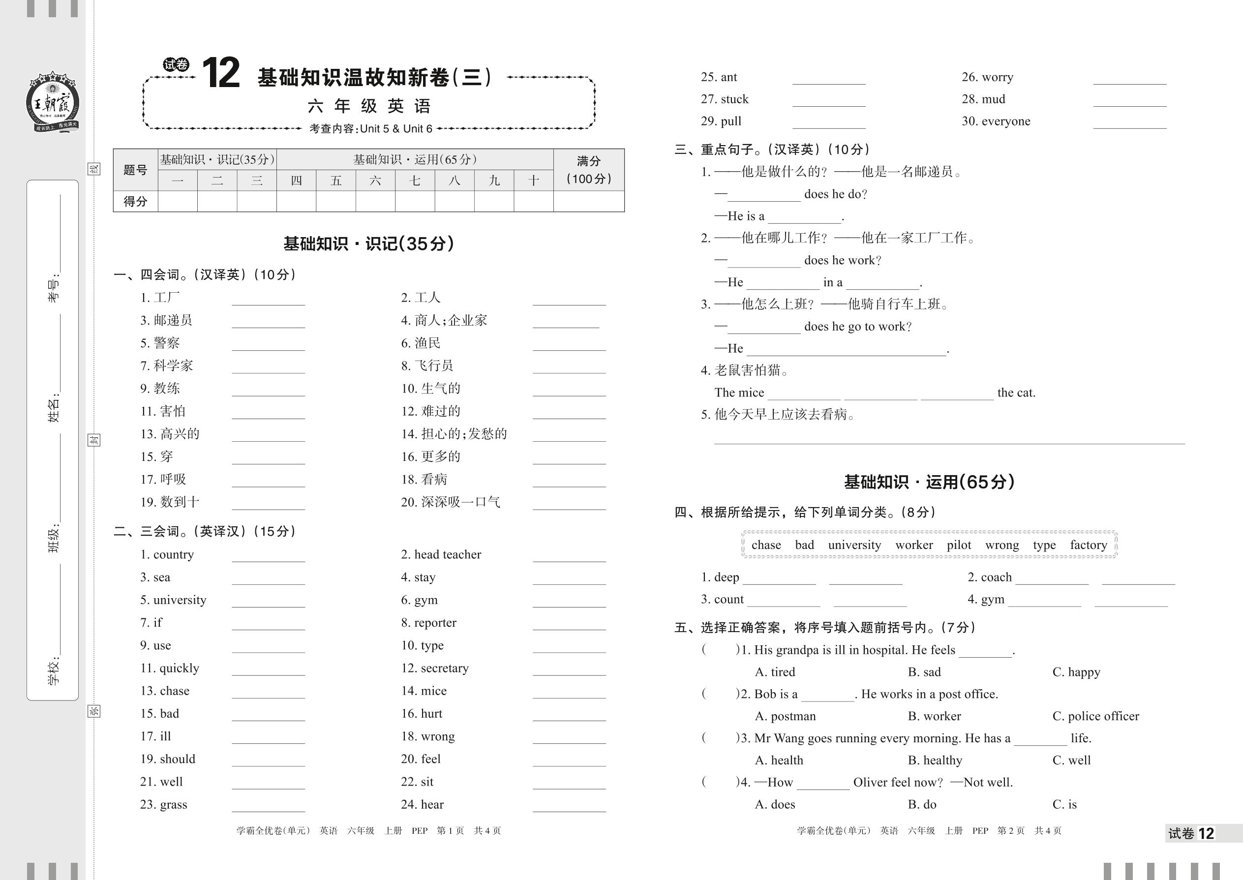 2022上册六年级英语人教PEP版 试卷12 基础知识温故知新卷(三)