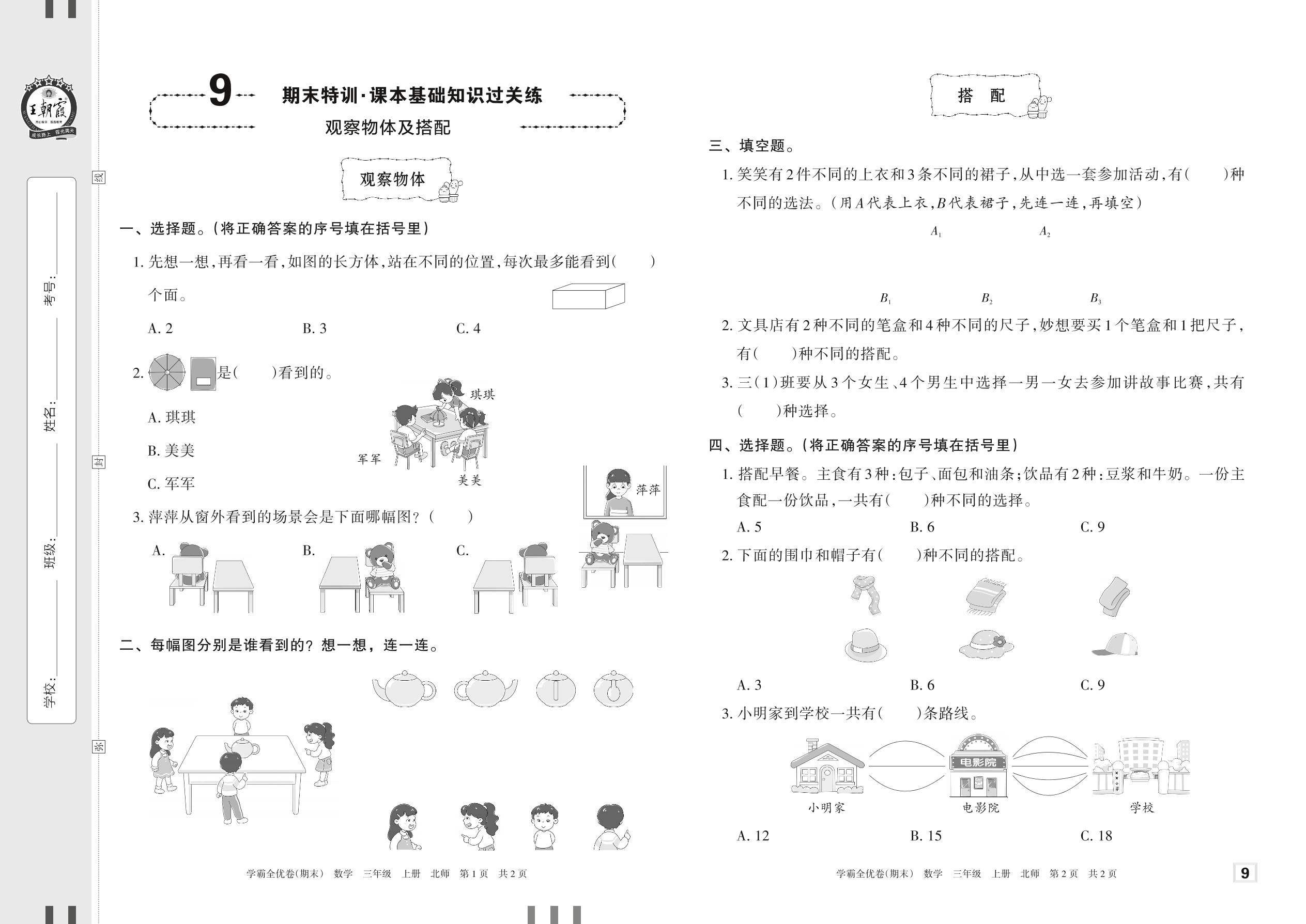 2022上册三年级数学北师版 9 期末特训·课本基础知识过关练——观察物体及搭配