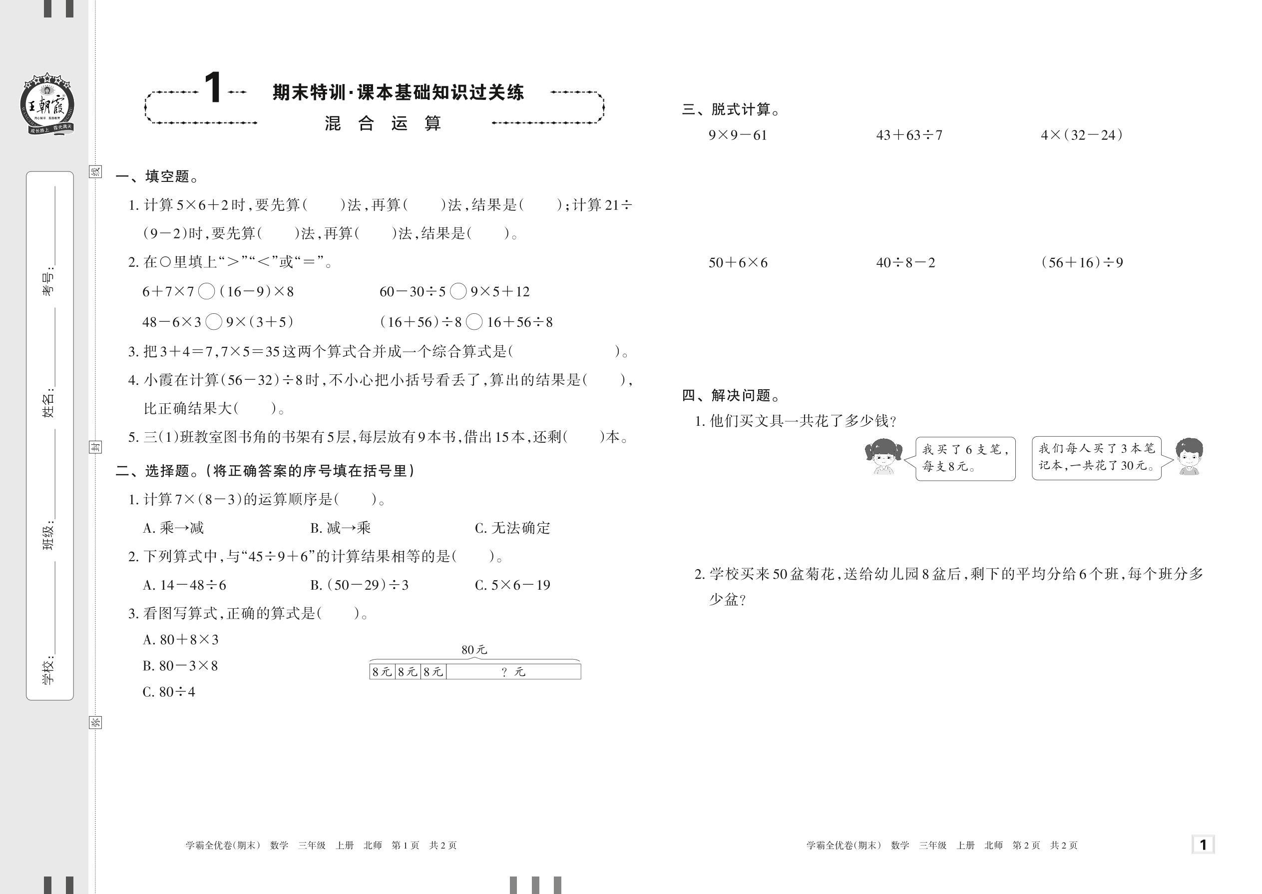 2022上册三年级数学北师版 1 期末特训·课本基础知识过关练——混合运算