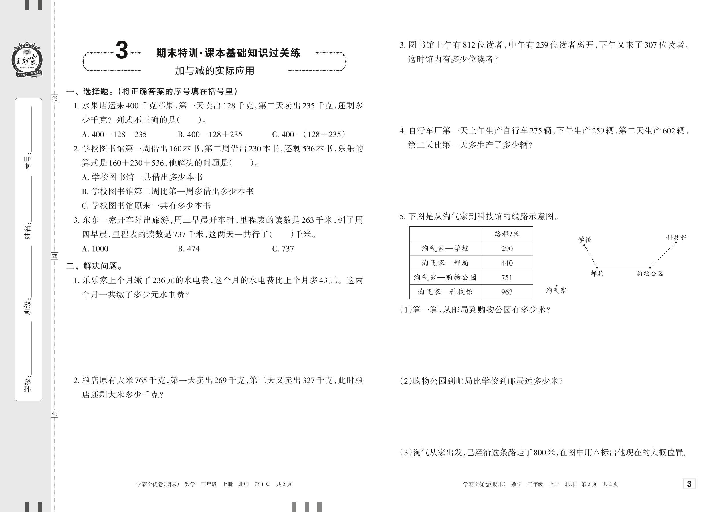2022上册三年级数学北师版 3 期末特训·课本基础知识过关练——加与减的实际应用
