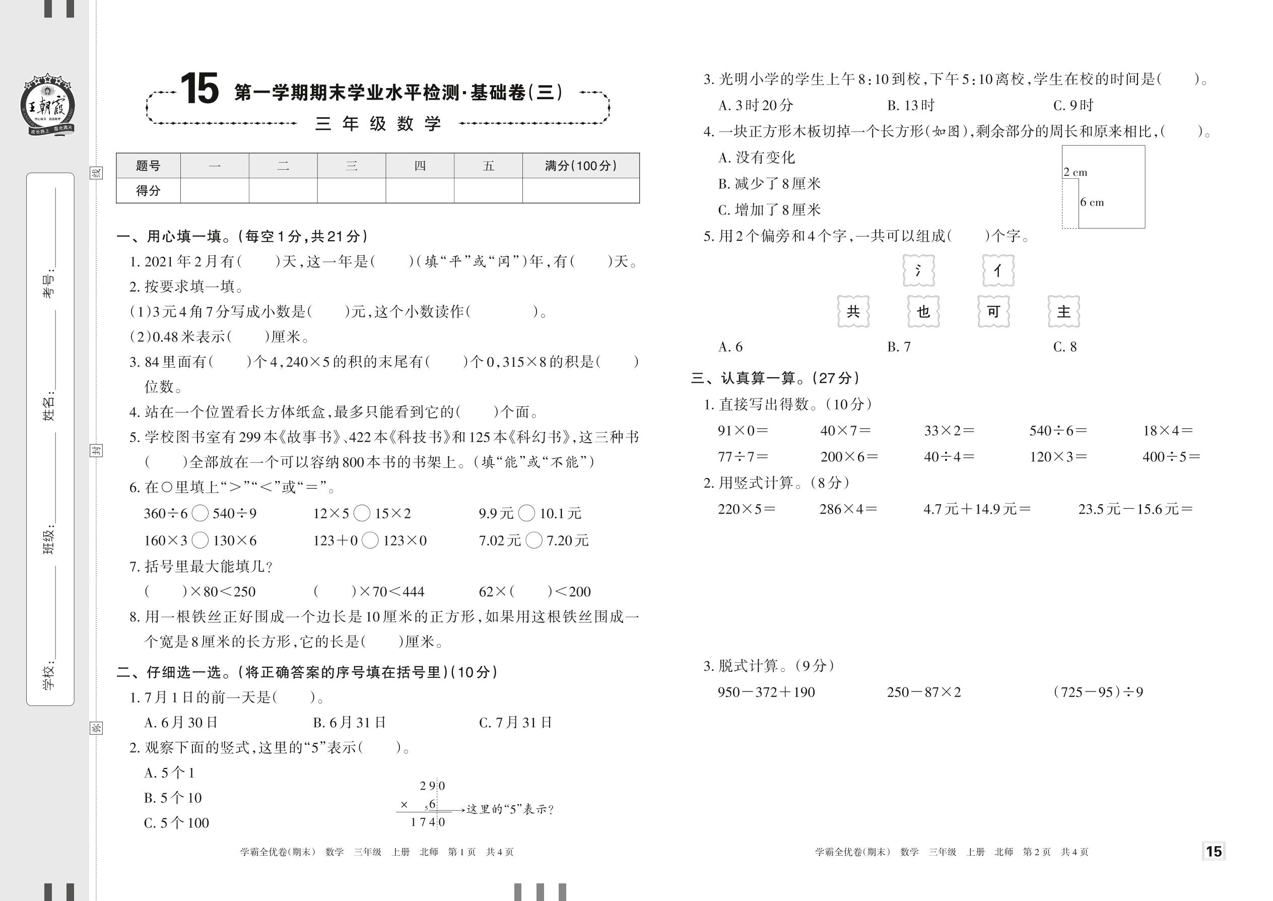 2022上册三年级数学北师版 15 第一学期期末学业水平检测·基础卷(三)