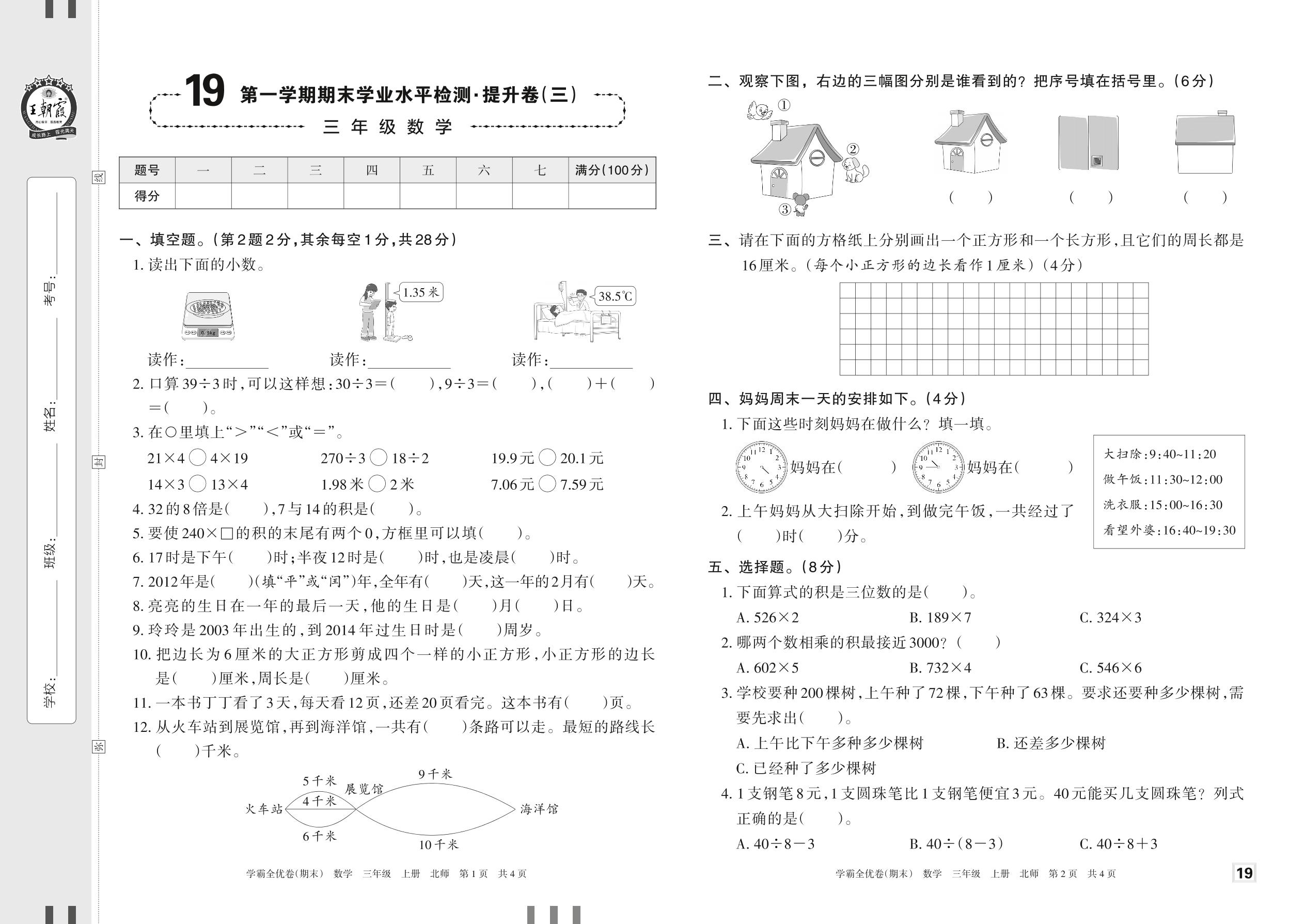 2022上册三年级数学北师版 19 第一学期期末学业水平检测·提升卷(三)