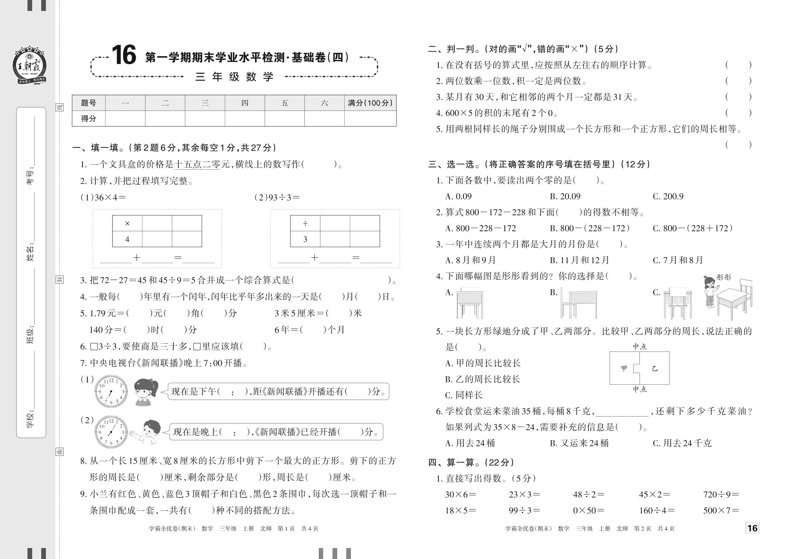 2022上册三年级数学北师版 16 第一学期期末学业水平检测·基础卷(四)