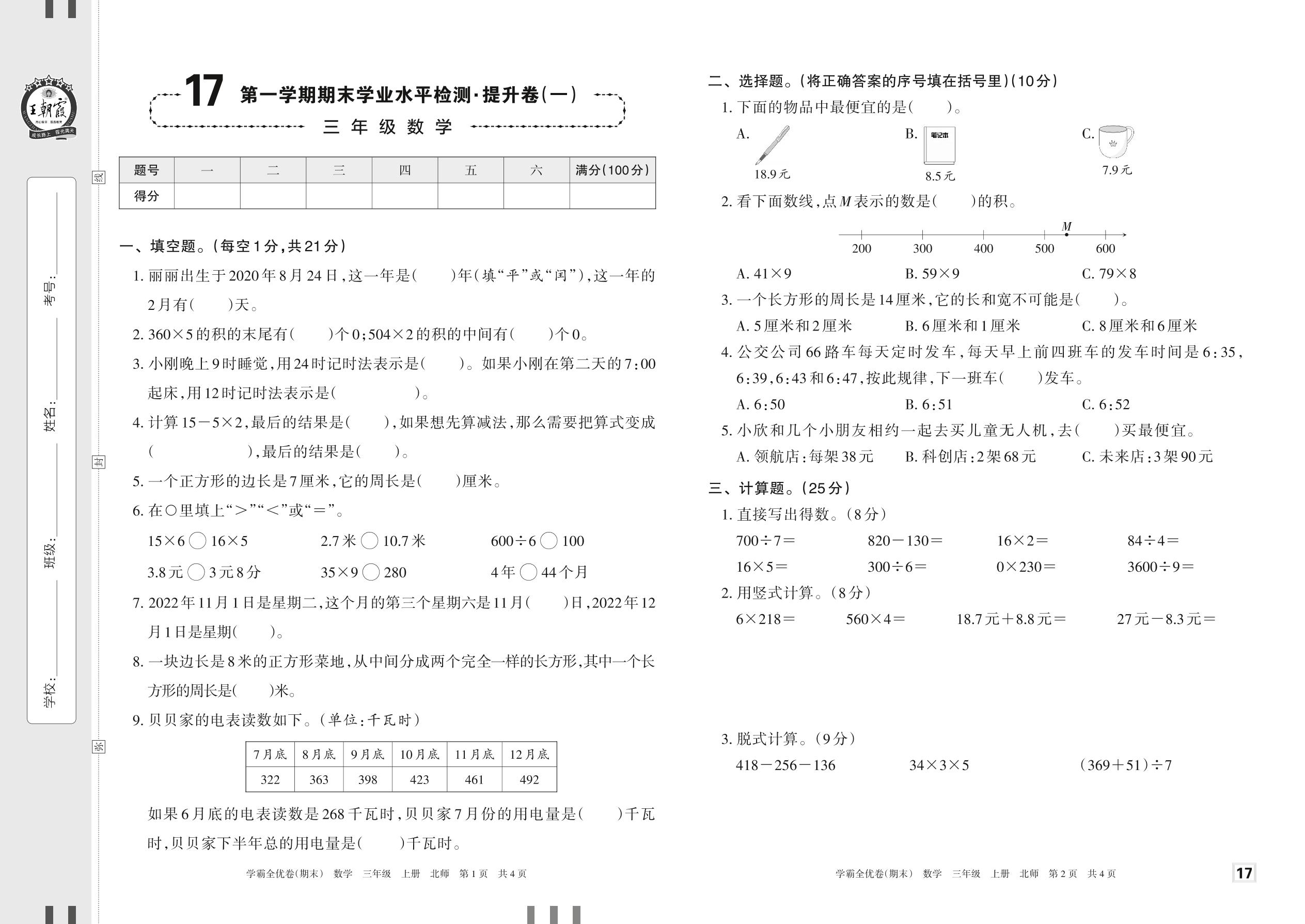 2022上册三年级数学北师版 17 第一学期期末学业水平检测·提升卷(一)