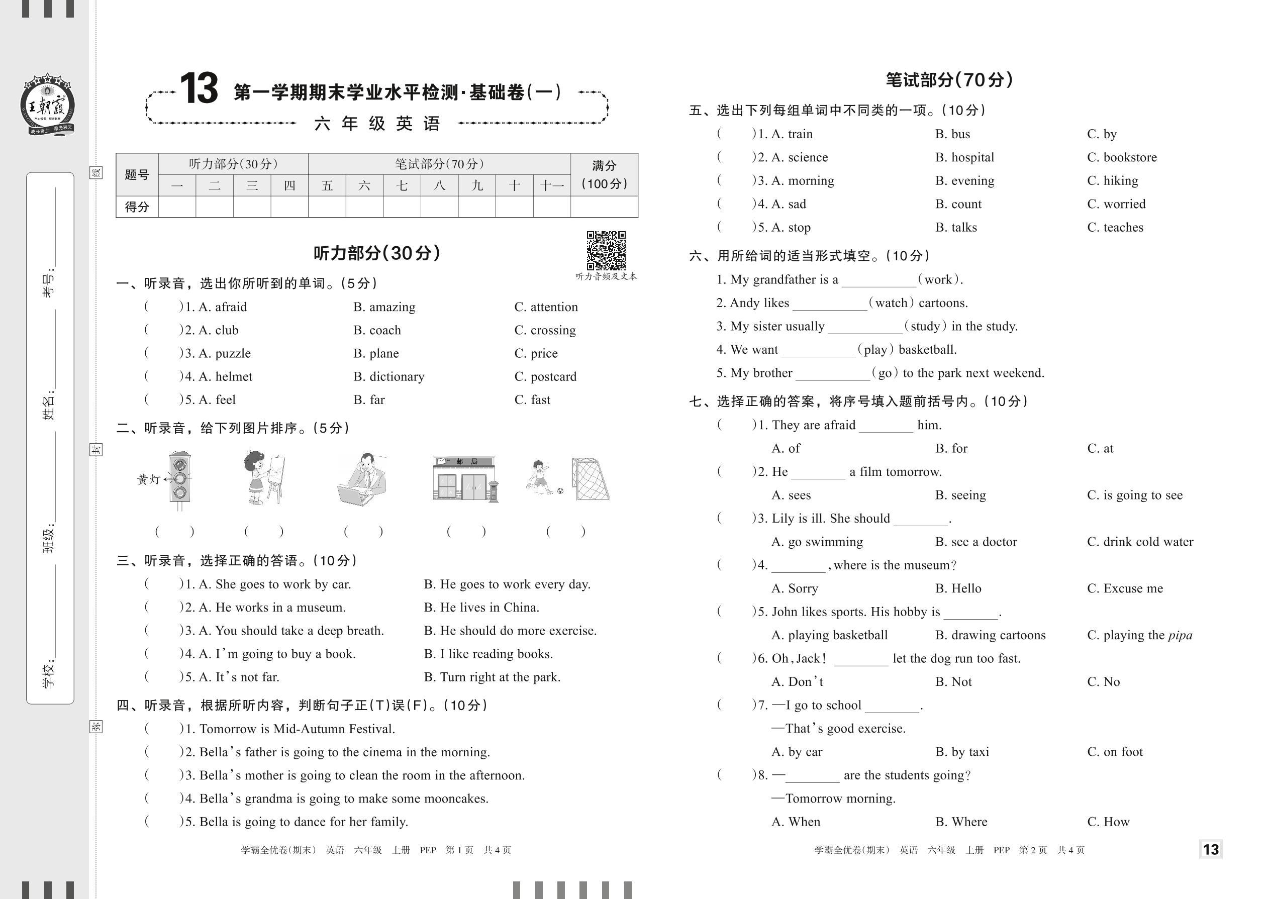 2022上册六年级英语人教PEP版 13 第一学期期末学业水平检测·基础卷(一)