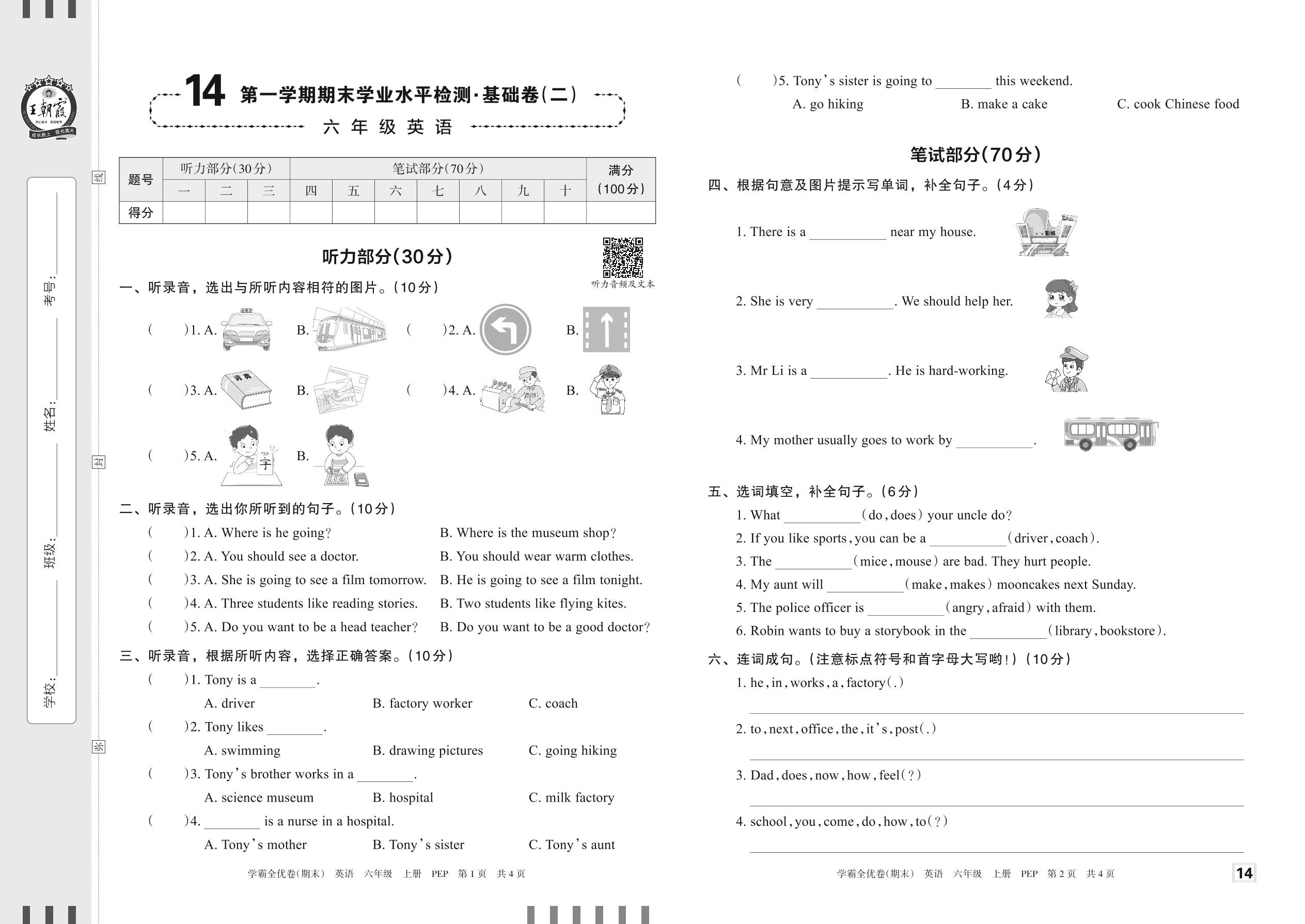 2022上册六年级英语人教PEP版 14 第一学期期末学业水平检测·基础卷(二)