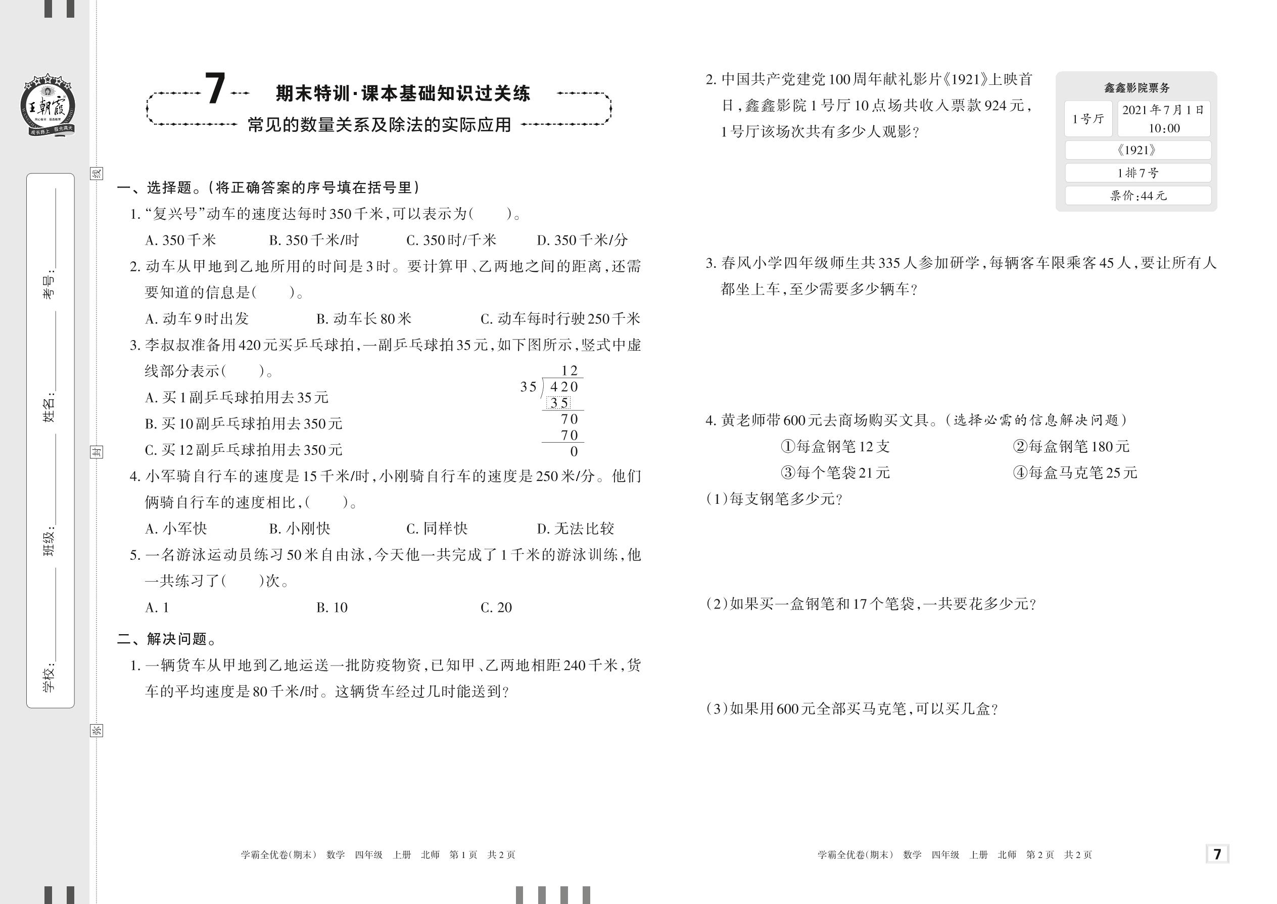 2022上册四年级数学北师版 7 期末特训·课本基础知识过关练——常见的数量关系及除法的实际应用