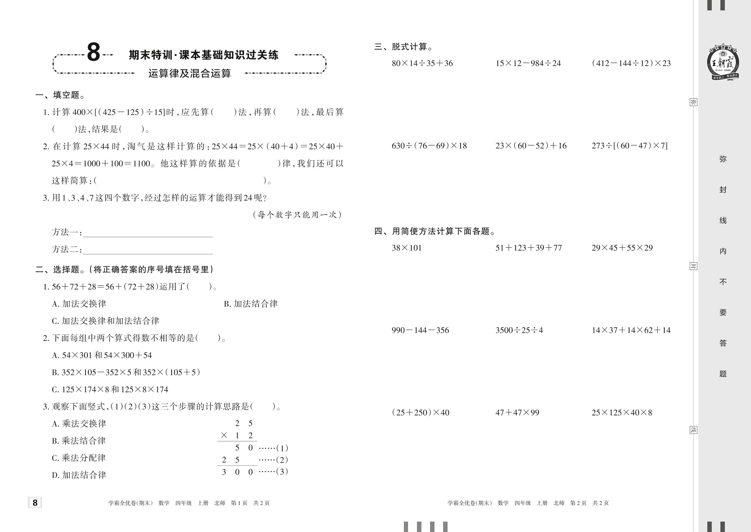 2022上册四年级数学北师版 8 期末特训·课本基础知识过关练——运算律及混合运算