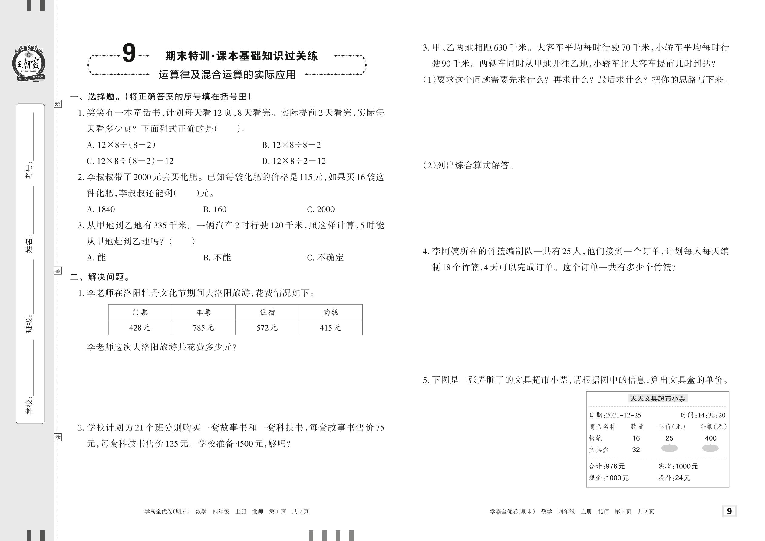 2022上册四年级数学北师版 9 期末特训·课本基础知识过关练——运算律及混合运算的实际应用