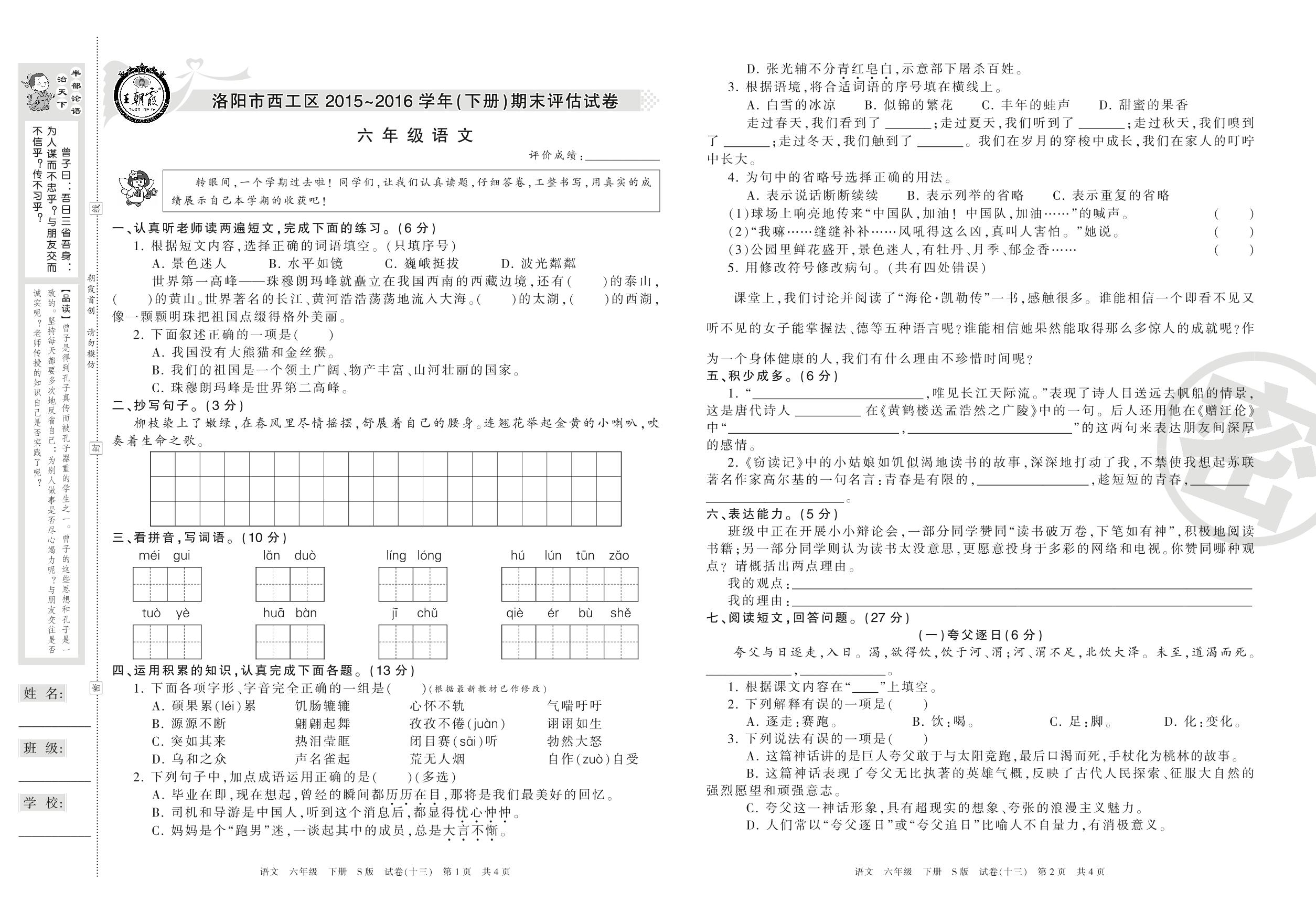 2015-2016学年第二学期洛阳市西工区六年级语文试卷(S版)【13】