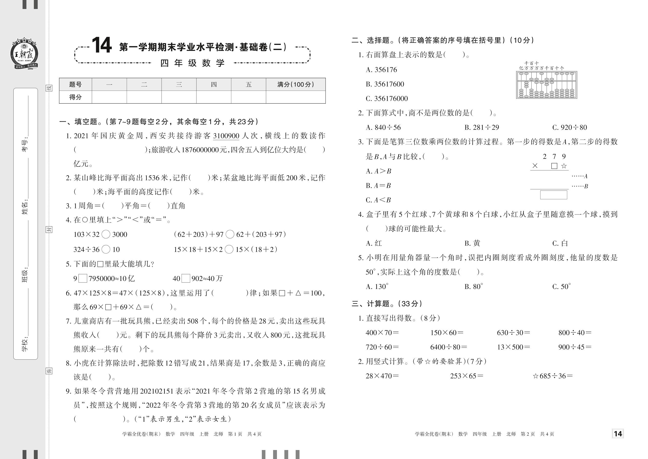 2022上册四年级数学北师版 14 第一学期期末学业水平检测·基础卷(二)