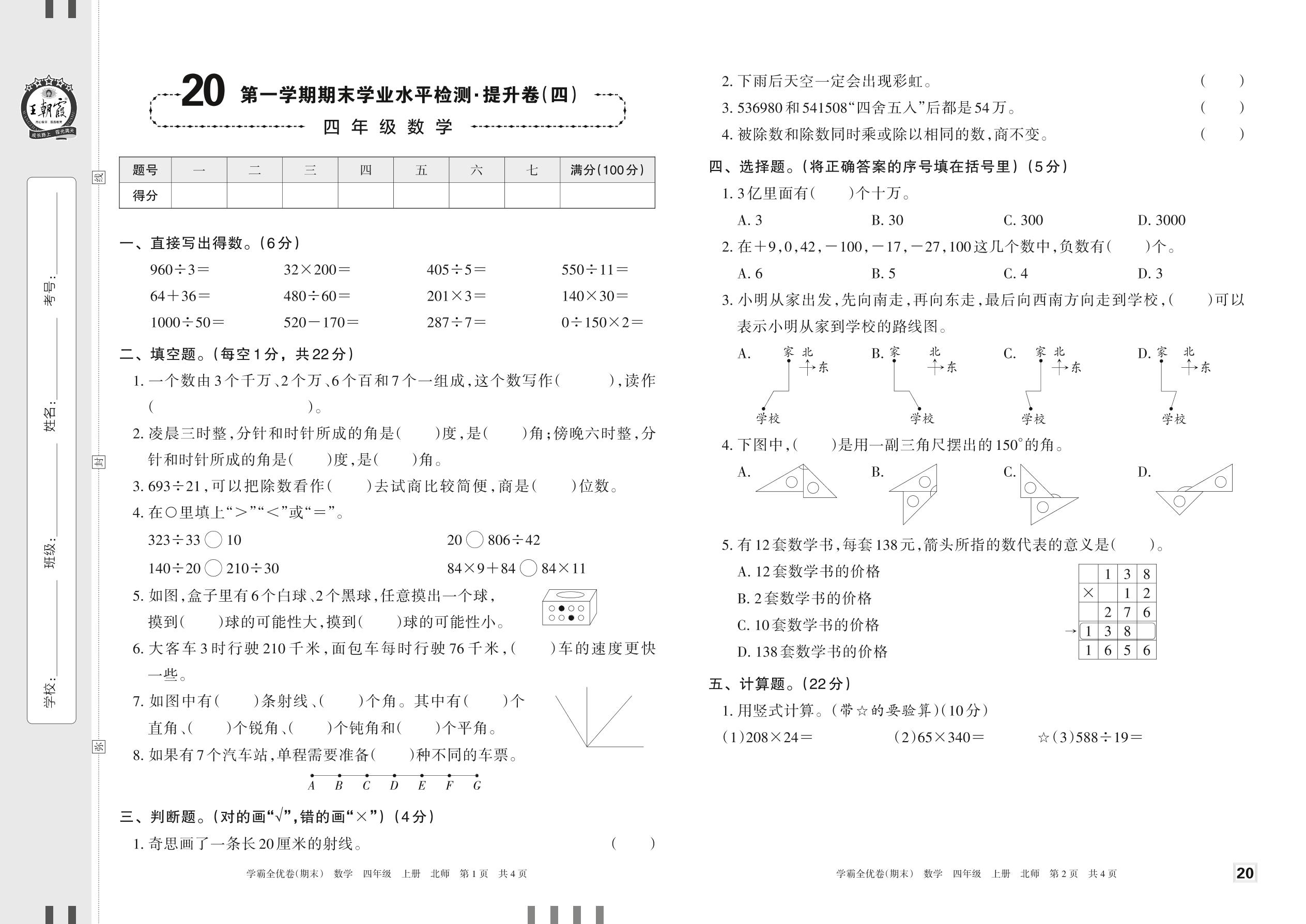 2022上册四年级数学北师版 20 第一学期期末学业水平检测·提升卷(四)