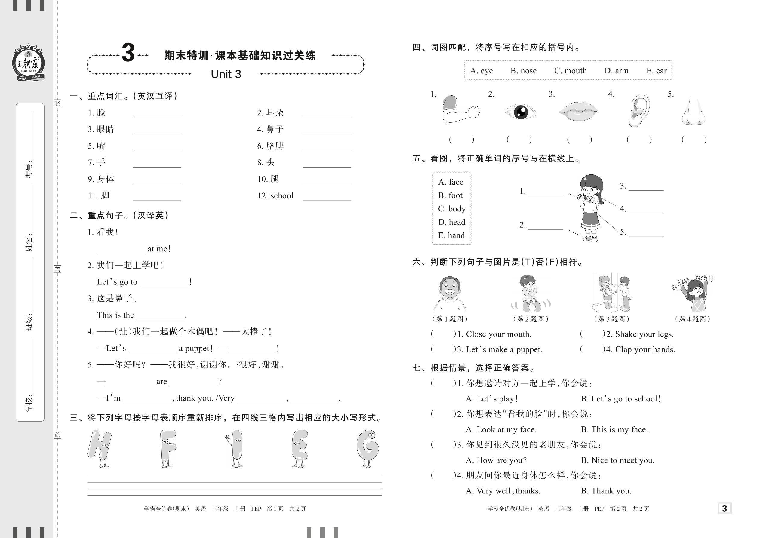 三年级英语人教PEP版(三起始)上册单元卷