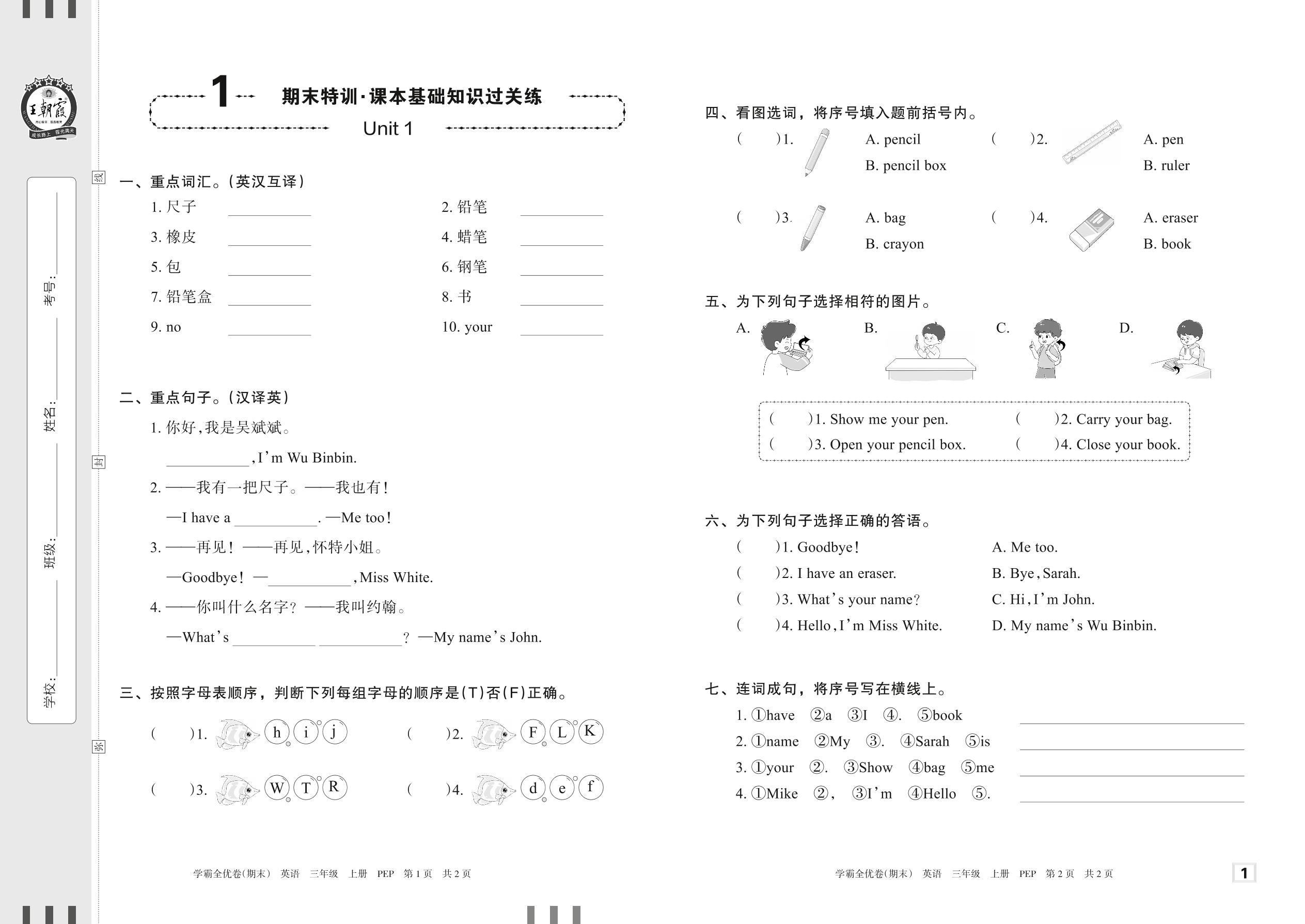 2022上册三年级英语人教PEP版 1 期末特训·课本基础知识过关练——Unit 1